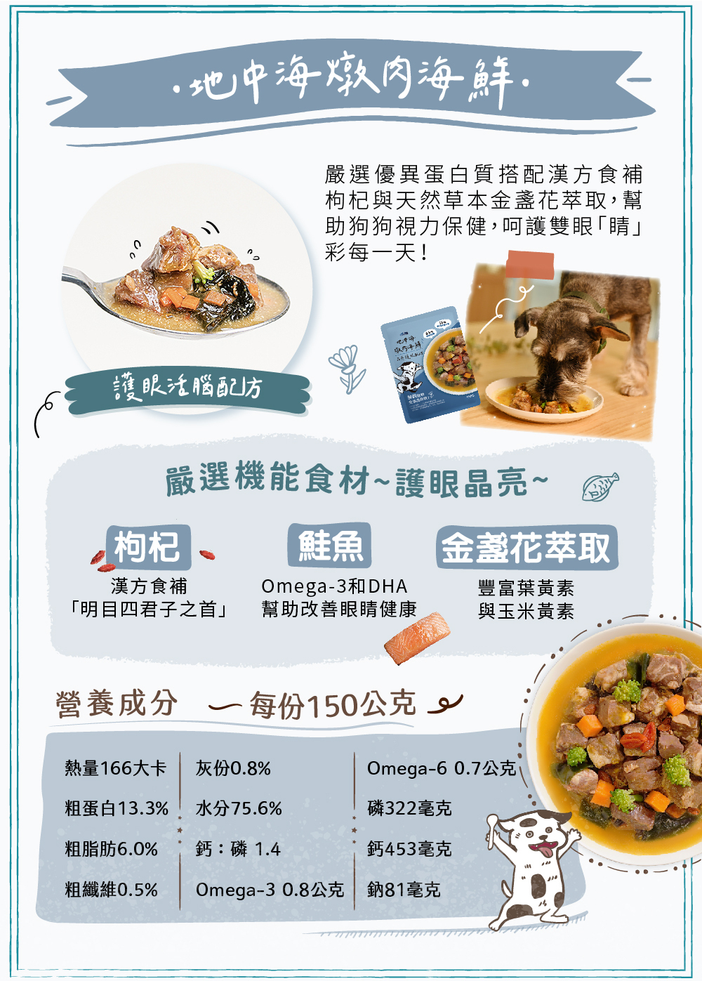 羊肉、牛肉、鮭魚、雞肝、南瓜、青花菜、胡蘿蔔、海帶芽、枸杞、杏仁、金盞花萃取、綜合維生素、綜合礦物質