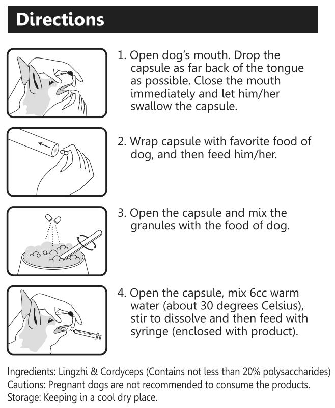 For dogs having difficulties in oral administration of capsules, owners can open the capsule and mix the medicinal powder with food or water for easy feeding and absorption of the essence of Lingzhi (Ganoderma lucidum) and Cordyceps.