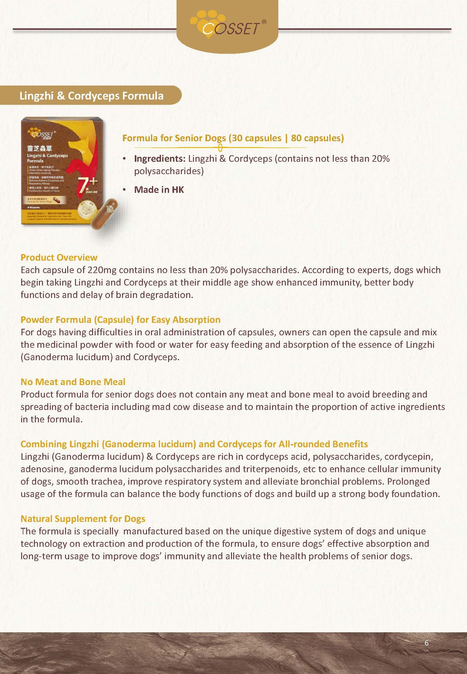 The product formula is composed of 6 species of Lingzhi (Ganoderma lucidum) in total and also Cordyceps which make the formula more effective than red Lingzhi alone. Each capsule of 220mg contains no less than 20% polysaccharides. Ingredients of the natural formula of pet supplement are clearly indicated for owners’ consideration. Moreover, according to experts, dogs which begin taking Lingzhi and Cordyceps at their middle age show enhanced immunity, better body functions and delay of brain degradation.