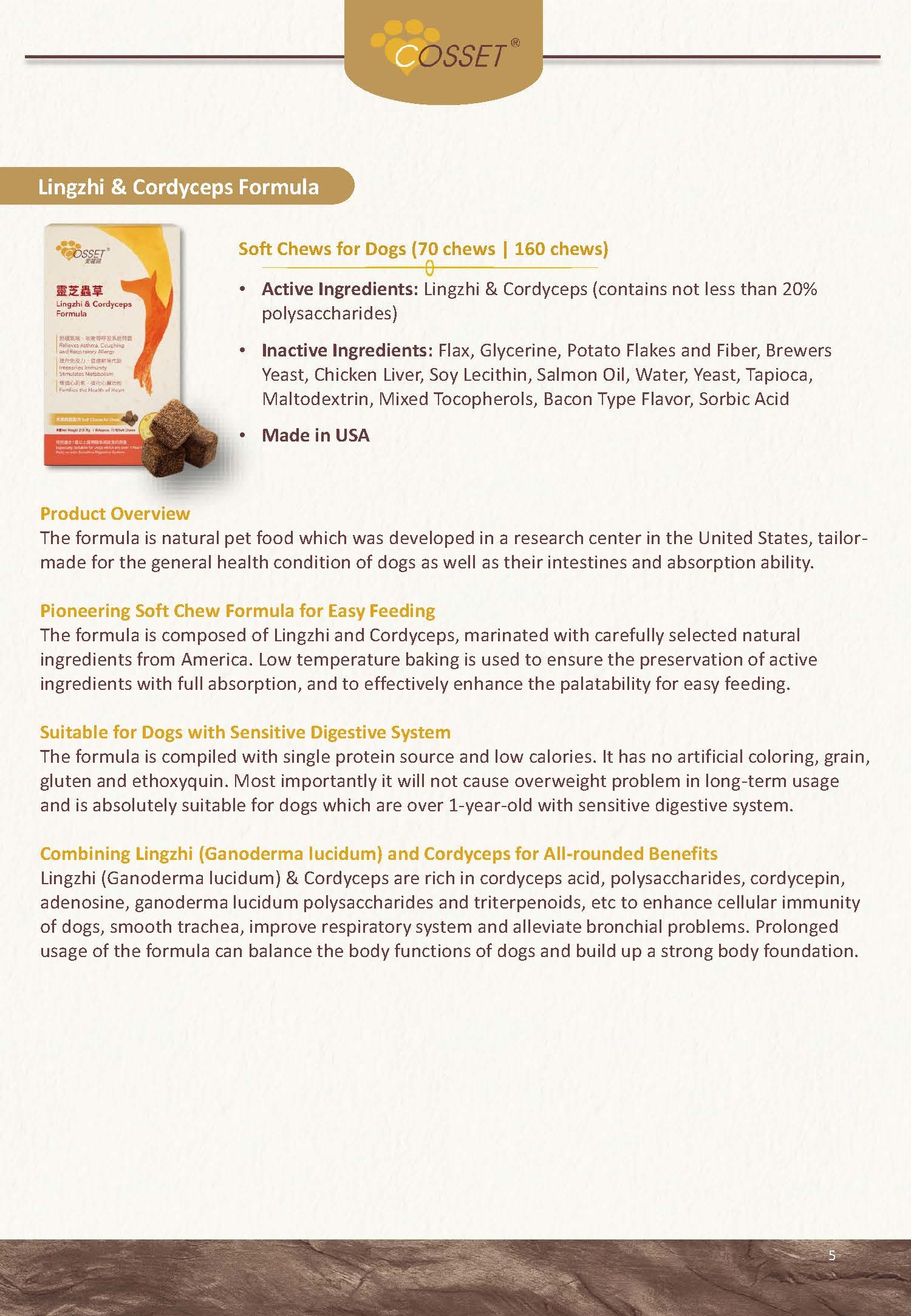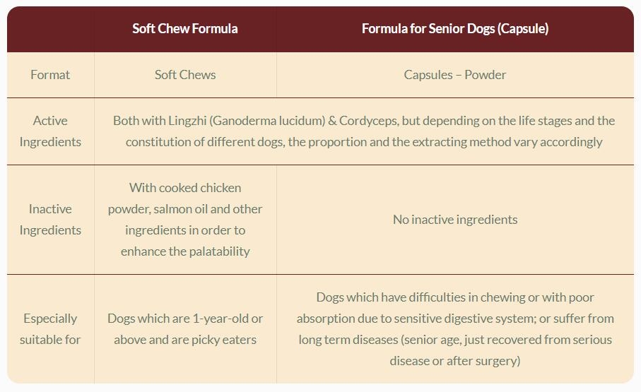 In order to improve the palatability of the soft chew formula, more kinds of superb inactive ingredients including cooked chicken powder and salmon oil have been added to the soft chews to let owners keep their picky dogs energetic and healthy in an easy way. Moreover, the proportion of Lingzhi (Ganoderma lucidum) & Cordyceps active ingredients is increased, so as to enhance the effectiveness of the product to build up a consolidated foundation of a strong physique for your beloved dogs.