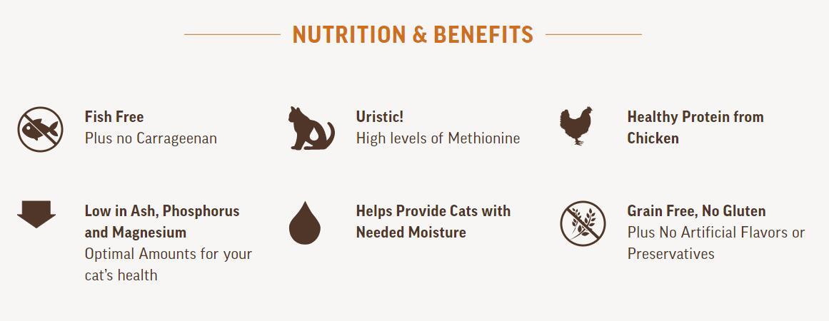 Chicken Pâté Entrée is 100% Grain Free and Carrageenan Free with low ash, phosphorus and magnesium, amounts optimized for your cats health.  All our Pâté Entrées are “Uristic”—formulated to help prevent urinary tract infections. This formula is also 100% fish free, great for picky eaters and sensitivities.