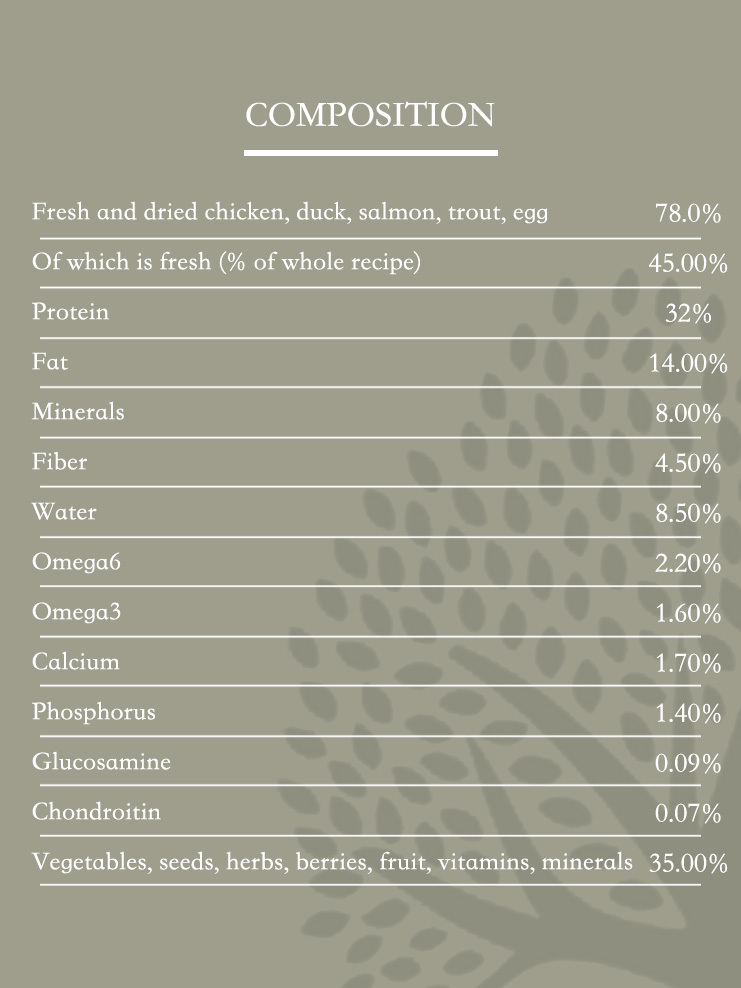 Fresh chicken and duck, dried chicken and duck, sweet potato, potato, peas, fresh salmon and trout, fresh whole egg, linseed, lucerne sprout, liver stock, pea fibre, vitamins, minerals, MOS, FOS, glucosamine*, chondroitin*, MSM* (*all from natural sources), cranberry, akai, blueberry, mulberry, apple, tomato, orange, pear, carrot, spinach, cauliflower, seaweed, marigold, ginseng, green tea, ginger.