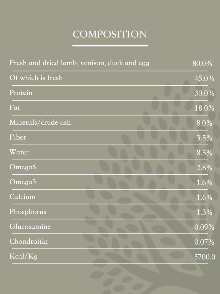 Fresh chicken and duck, dried chicken and duck, sweetpotato, peas, fresh salmon and trout, linseed, fresh wholeegg, chicken fat, potato, liver stock, lucerne sprout, vitamins,minerals, MOS (mannan oligosaccarides), FOS(fructooligosaccharides), glucosamine, chondroitin,MSM (metylsulfonylmetan) cranberry, acai, blueberry,mulberry, apple, tomato, orange, pear, carrot, spinach,cauliflower, seaweed, marigold, ginseng, green tea, ginger.