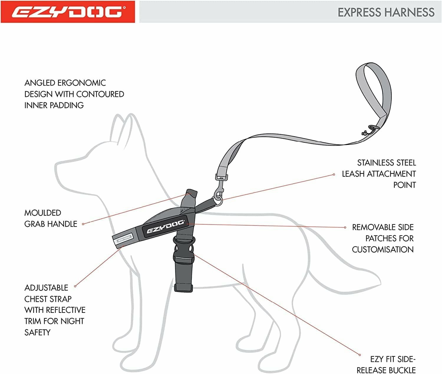 The Express™ Harness is a dog walking harness that offers a number of handy features in a minimalist, sleek design. This harness features contouring EVA pads, molded grab handle, accessory D ring and reflective trim. The harness is made from PP webbing with an extremely soft hand feel, meaning it is strong and durable, yet extremely comfortable.