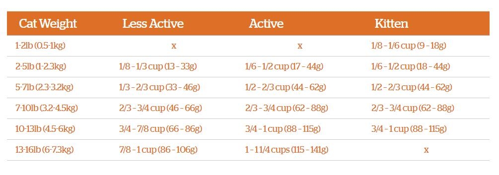 The amount of food your cat needs will vary depending on activity level, age and climate. Use our feeding chart as a guide, adjusting the quantity fed to achieve your cat’s ideal weight.