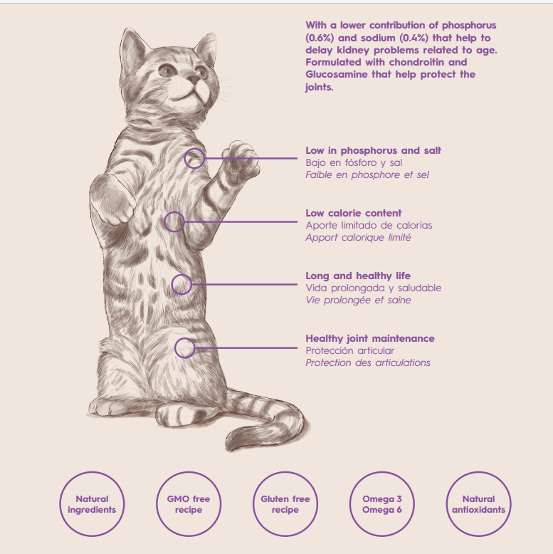 With a low content of phosphorus (0.6%) and sodium (0.4%) that help delay age-related kidney problems, and formulated with chondroitin and glucosamine to help protect the joints.