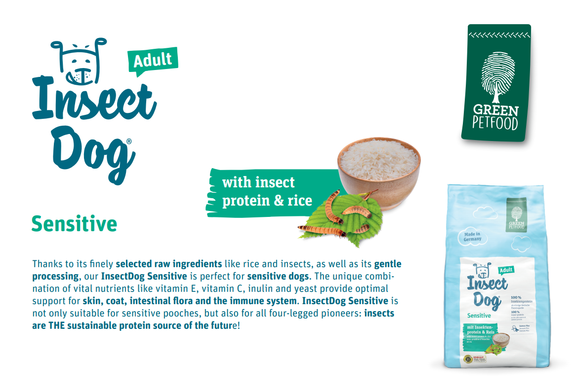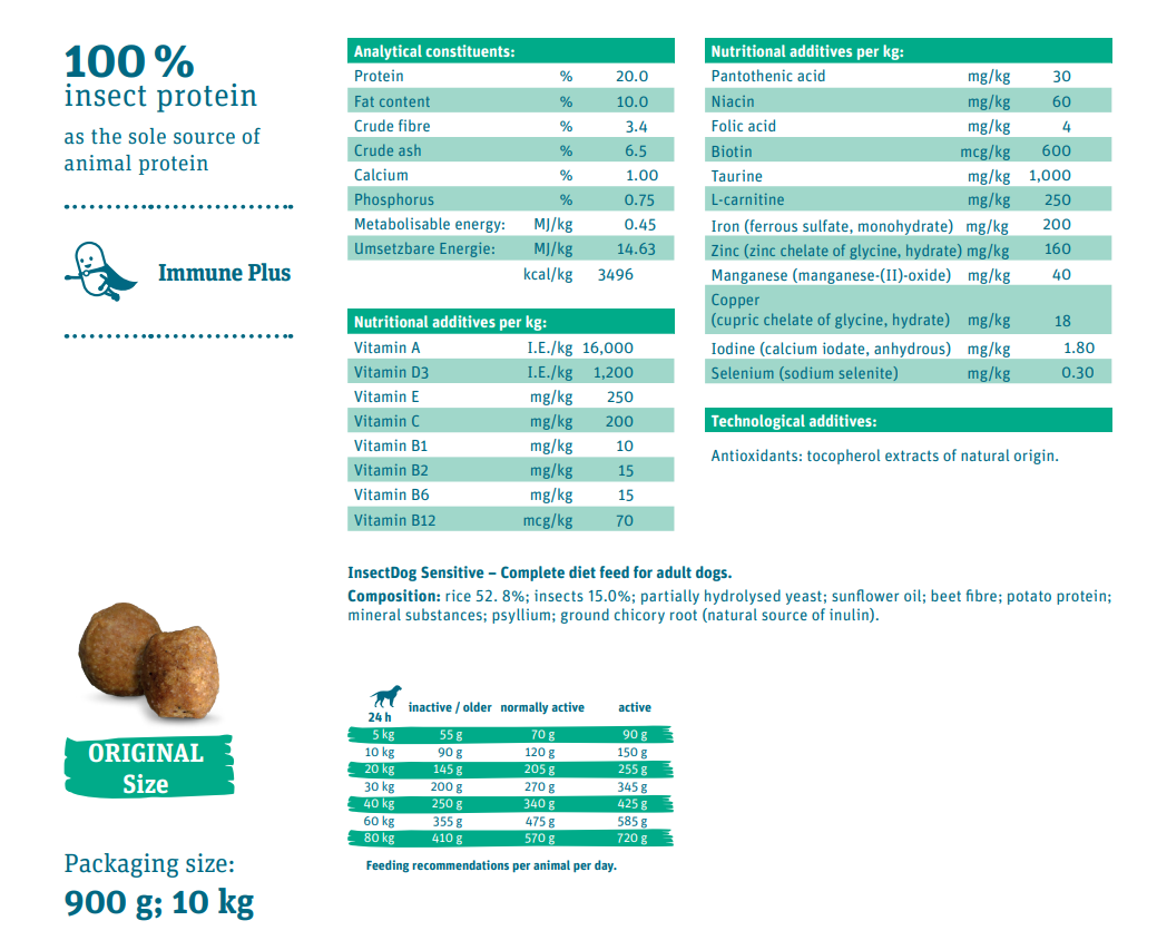 rice 52. 8%; insects 15,0%; partially hydrolysed yeast; sunflower oil; beet fibre; potato protein; mineral substances; psyllium; ground chicory root (natural source of inulin).