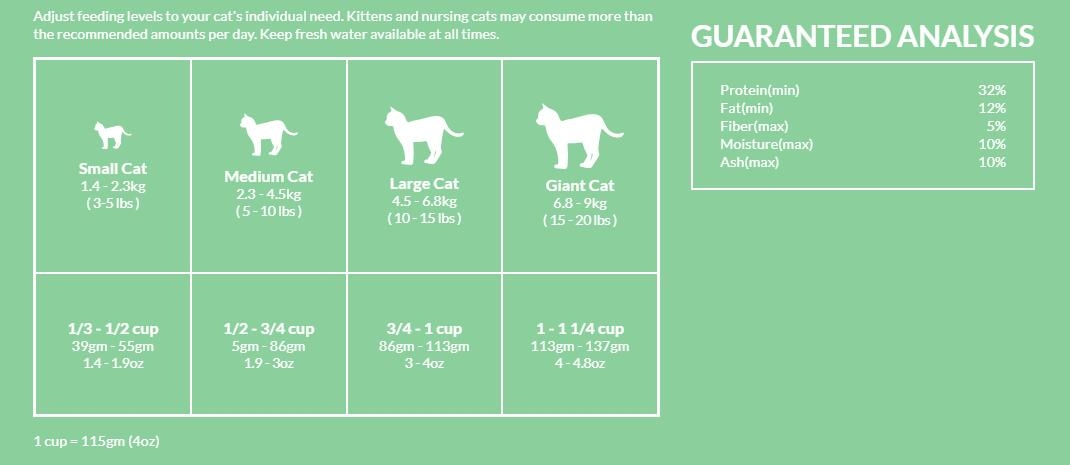 Fish Meal, Chicken, Peas, Tapioca, ChickenFat (preserved with mixed tocopherols), Flaxseed, Natural Flavor, Fish Oil,Potassium Chloride, Sodium Chloride, Choline Chloride, Magnesium Sulfate,Vitamin E Supplement, Niacin (Vitamin B3), Calcium Pantothenate (Vitamin B5),Vitamin A Supplement, Thiamine Mononitrate (Vitamin B1), Riboflavin Supplement,Pyridoxine Hydrochloride (Vitamin B6), Biotin (Vitamin B7), Vitamin B12Supplement, Vitamin D3 Supplement, Folic Acid (Vitamin B9), Taurine, ZincSulfate, Ferrous Sulfate, Copper Sulfate, Manganese Sulfate, Calcium Iodate,Cobalt Sulfate, Sodium Selenite, Calcium Propionate, Green Tea Extract,Rosemary Extract, Spearmint Extract.