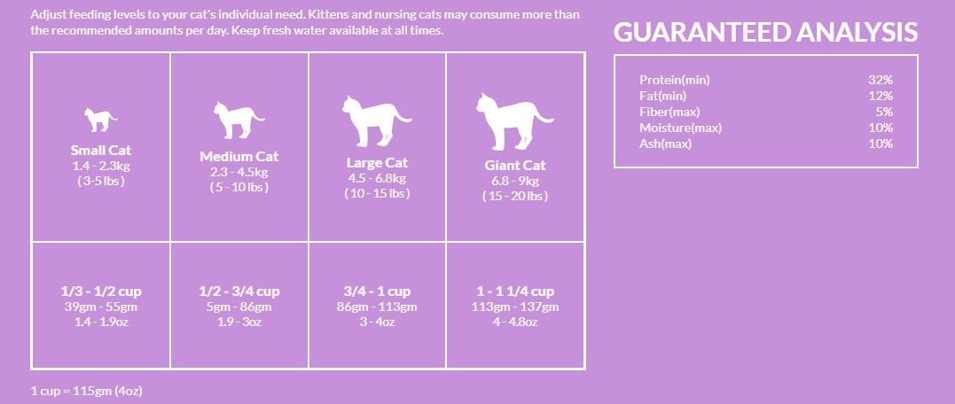 Fish Meal, Salmon Head, Peas, Tapioca,Chicken Fat (preserved with Mixed Tocopherols), Flaxseed, Natural Flavor, Fish Oil,Potassium Chloride, Sodium Chloride, Choline Chloride, Magnesium Sulfate,Vitamin E Supplement, Niacin (Vitamin B3), Calcium Pantothenate (Vitamin B5),Vitamin A Supplement, Thiamine Mononitrate (Vitamin B1), Riboflavin Supplement,Pyridoxine Hydrochloride (Vitamin B6), Vitamin B12 Supplement, Vitamin D3Supplement, Folic Acid (Vitamin B9), Taurine, Zinc Sulfate, Ferrous Sulfate,Copper Sulfate, Manganese Sulfate, Calcium Iodate, Cobalt Sulfate, SodiumSelenite, Calcium Propionate, Green Tea Extract, Rosemary Extract, SpearmintExtract.