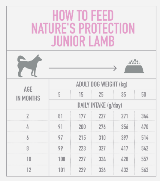 Serve the food dry. When you feed your dog Nature’s Protection for the first time, gradually introduce it into your dog’s diet over a period of 3 days. Clean, fresh water should be available at all times.
