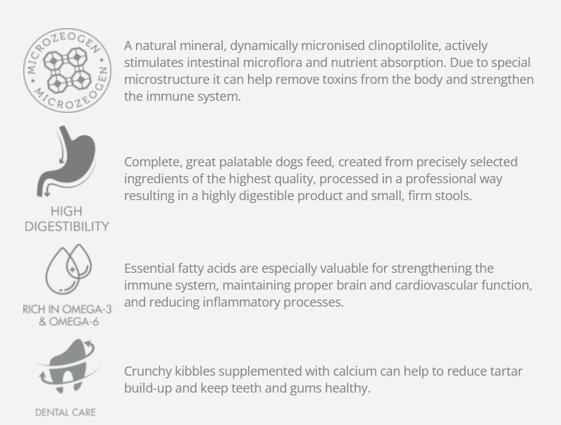 • Complete dogs feed, created from precisely selected ingredients of the highest quality, processed in a professional way resulting in a highly digestible product and small, firm stools.