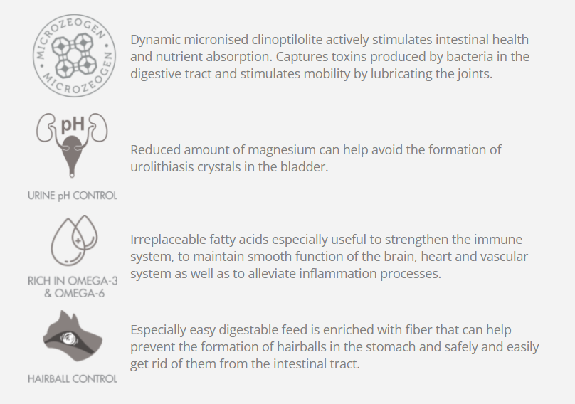 poultry meat 39% (dried and finely ground), rice, maize, maize gluten, poultry fat, sugar beet pulp, cellulose, brewer’s yeast, fish meal, dynamic micronized clinoptilolite (1%), dried eggs, chicory extract, mannan-oligosaccharides (MOS), yucca extract, marigold meal.