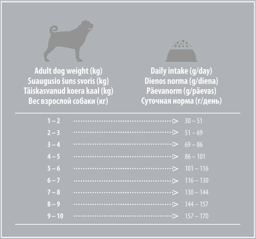 Clean, fresh water shouldServe the food dry. When you feed your dog Superior Care for the first time, gradually introduce it into your dog’s diet over a period of 3 days. Feeding amounts: see table. Your dog may eat more or less depending on age, temperament and activity level.