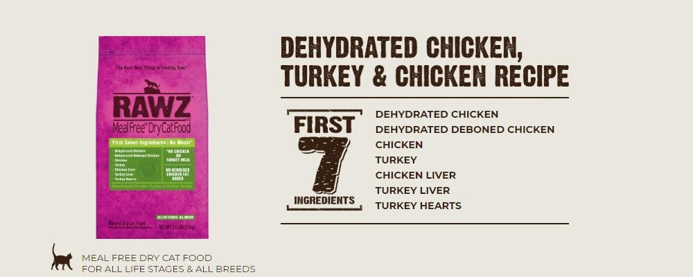 Meal Free Dry Food - RAWZ uses only dehydrated chicken asour natural concentrated protein source. Our dehydrated chicken has a higherP.E.R. Value (Protein Efficiency Ratio) than rendered meals. It is gentlycooked at much lower temperatures, which helps retain protein and amino acids,keeping the protein in a more natural state.