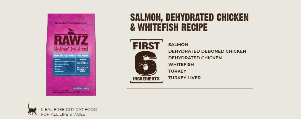 Meal Free Dry Food - RAWZ uses only dehydrated chicken asour natural concentrated protein source. Our dehydrated chicken has a higherP.E.R. Value (Protein Efficiency Ratio) than rendered meals. It is gentlycooked at much lower temperatures, which helps retain protein and amino acids,keeping the protein in a more natural state.