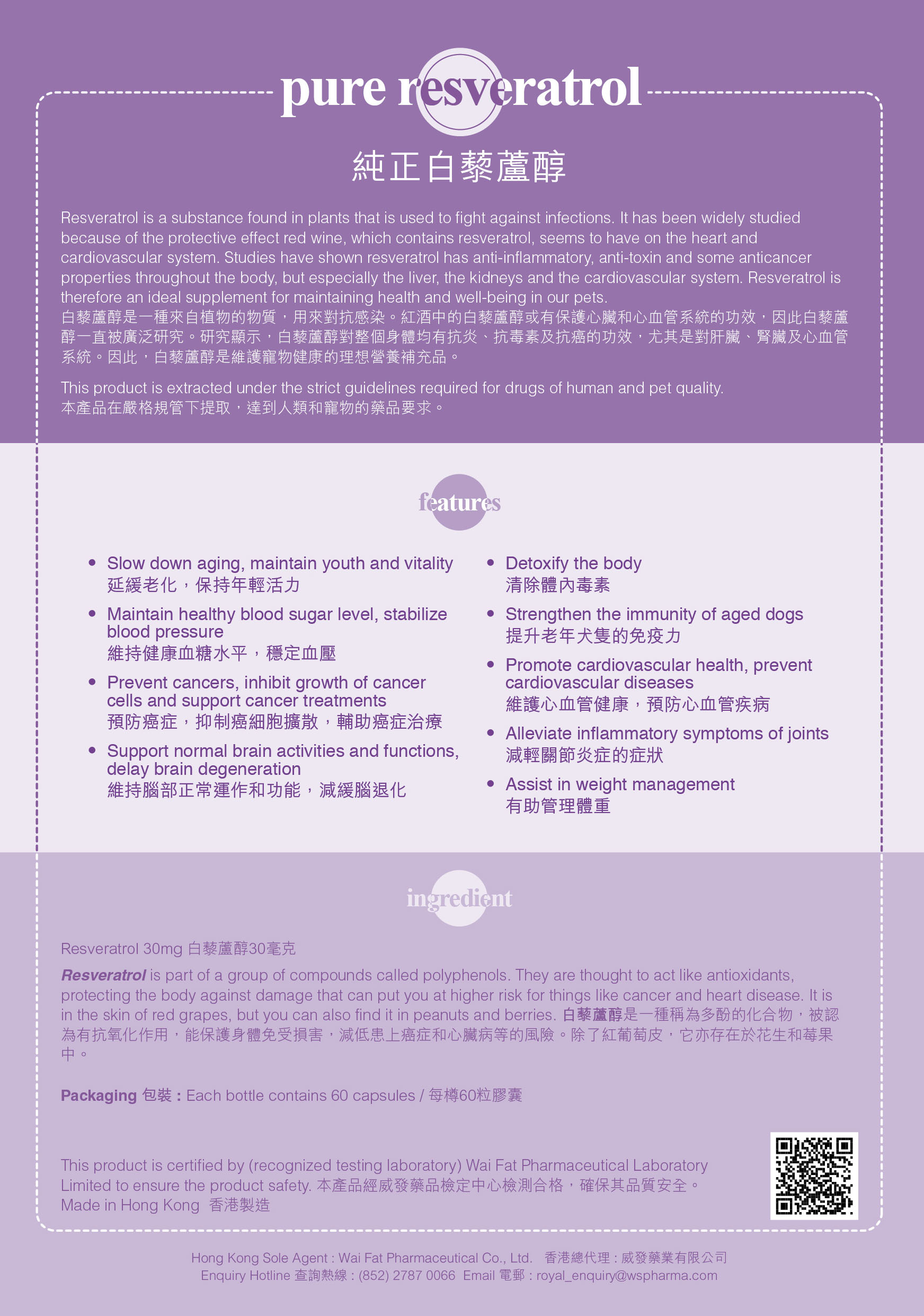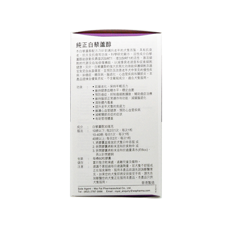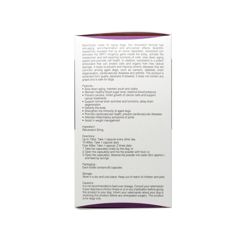 Specifically made for aging dogs, this resveratrol formula has anti-aging, anti-inflammation and anti-cancer effects. Scientific researches revealed that as an active ingredient, resveratrol can stimulate the SIRT1 longevity gene inside the body, activate the metabolism and self-repairing functions of cells, slow down aging speed and promote cell health. In addition, resveratrol is a potent antioxidant that can protect cells and organs from free radical damage. It helps to prevent and improve chronic diseases that are common among aged dogs, such as cancers, diabetes, brain degeneration, cardiovascular diseases and arthritis. This product is extracted from quality Japanese Knotweed. It does not contain any grape and is safe for dogs.