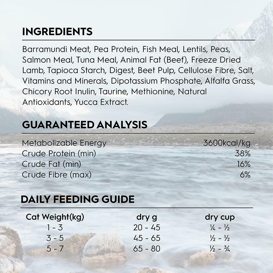 Barramundi meat, Pea Protein, Fish Meal, Lentils, Peas, Salmon meal, Tuna meal, Animal Fat (Beef), Freeze Dried Lamb, Tapioca Starch, Digest, Beet Pulp, Cellulose Fibre, Salt, Vitamins and Minerals, Dipotassium Phosphate, Alfalfa grass, Chicory Root Inulin, Taurine, Methionine , Nature Antioxidants, Yucca Extract