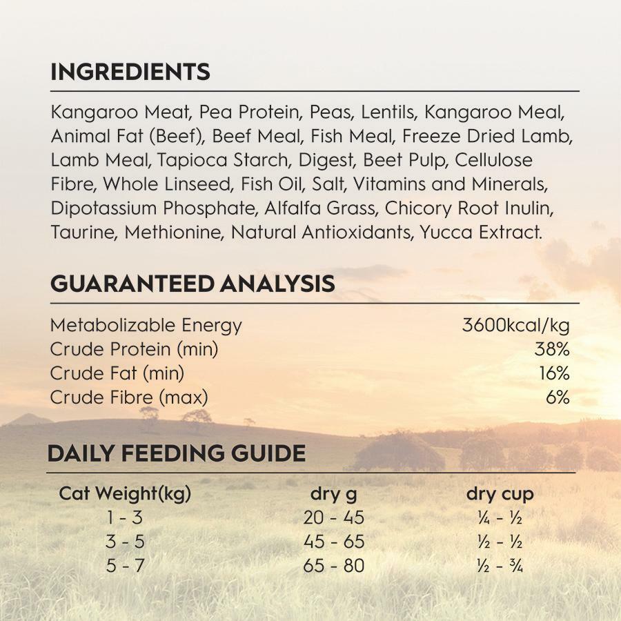 Kangaroo Meat, Pea Protein, Peas, Lentils, Kangaroo Meal, Animal Fat(Beef), Beef Meal, Fish Meal, Freeze Fried Lamb, Lamb Meal, Tapioca Starch, Digest, Beef Pulp, Cellulose Fibre, Whole Linseed, Fish Oil, Salt , Vitamins and Minerals, Dipotassium Phosphate, Alfalfa Grass, Chicory Root Inulin, Taurine, Methionine, Natural Antioxidants, Yucca Extract.