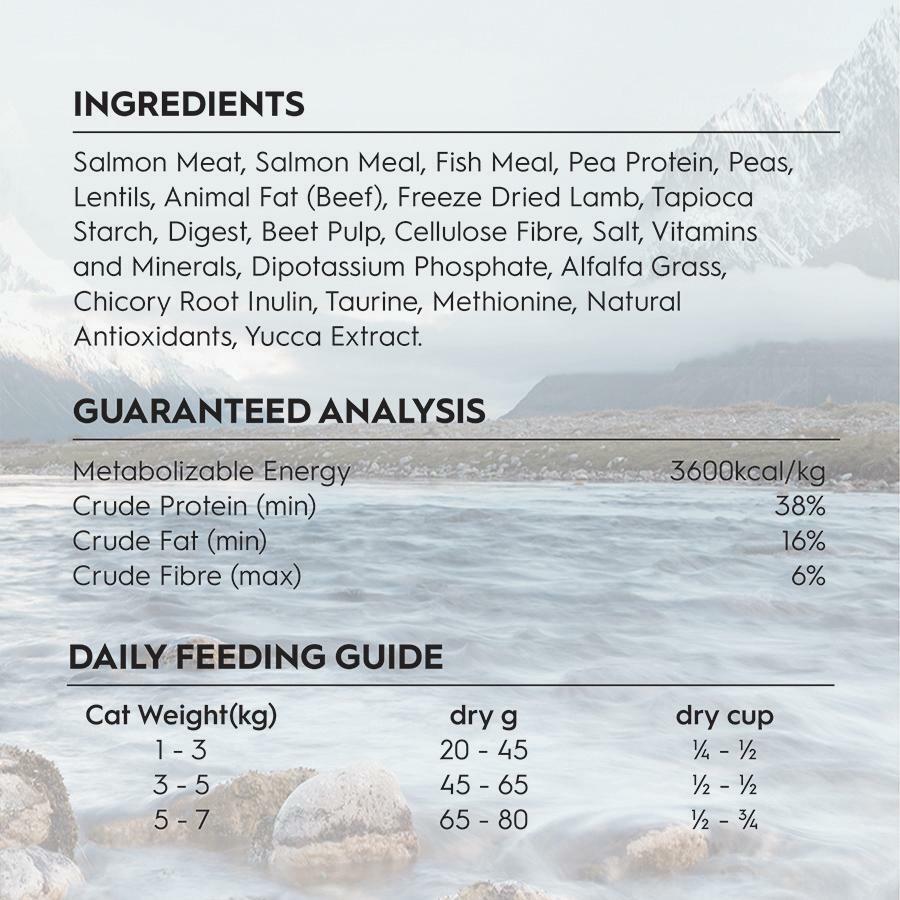 Salmon meat, Salmon meal, Fish meal, Pea Protein, Peas, Lentils, Animal Fat (Beef), Freeze Dried Lamb, Tapioca Starch, Digest, Beet Pulp, Cellulose Fibre, Salt, Vitamins and Minerals, Dipotassium Phosphate, Alfalfa grass, Chicory Root Inulin, Taurine, Methionine, Nature Antioxidants, Yucca Extract.
