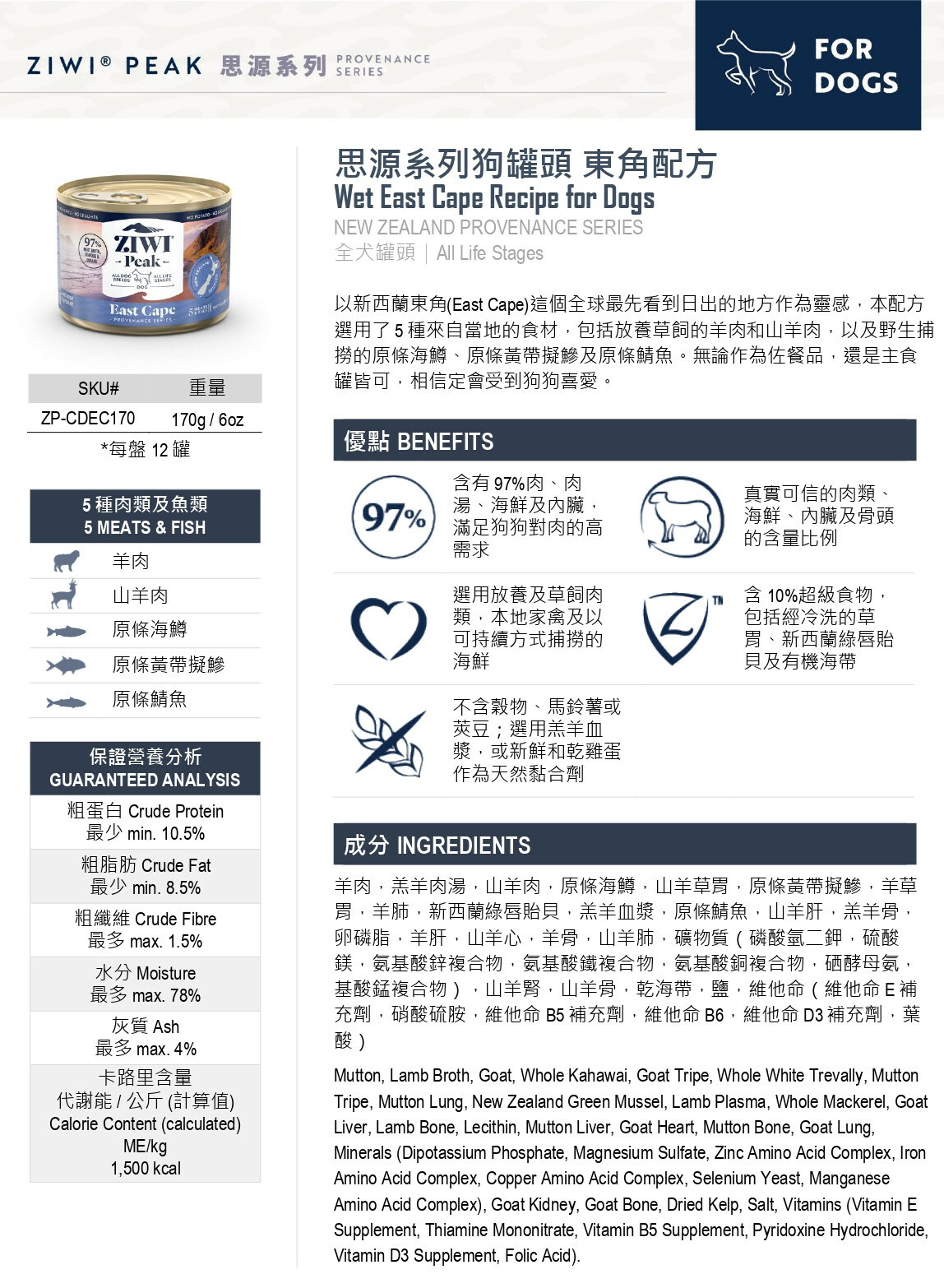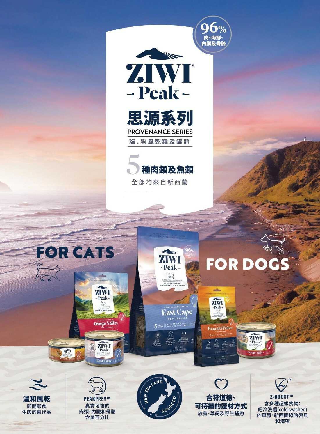 Featuring 5 meats and fish from New Zealand's East Cape, this recipe combines free-range and grass-fed mutton and goat, along with a blend of wild-caught and whole fish - kahawai, white trevally, and blue mackerel. The first place on earth to see the sunrise, New Zealand’s spectacular East Cape is the inspiration behind ZIWI® Peak’s East Cape Provenance recipe. It’s a perfect topper or complete meal that dogs are sure to love.