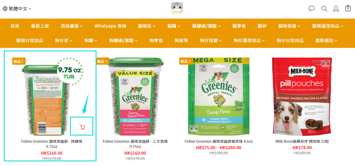 可點擊商品的右下角「快速加入購物車」,或點擊商品後選取數量後按「加入購物車」