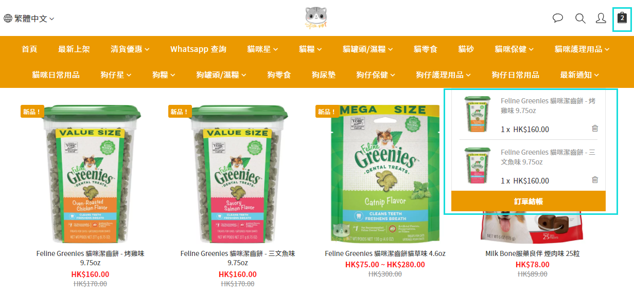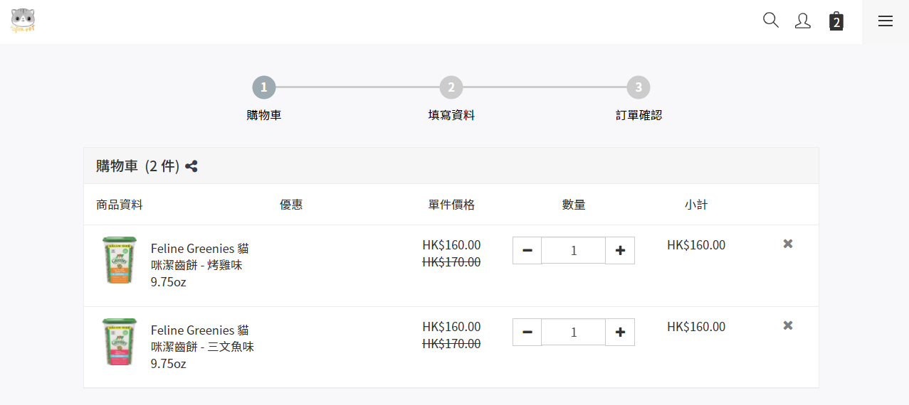 請檢查購物車內之購買型號及數量是否正確。如發現選擇商品或數量有誤,可於購物車內按「x 」刪除產品或按「+ 」「- 」 ,以調整購買數量。如沒有問題可以在同一頁面下半部分填寫送貨資料。