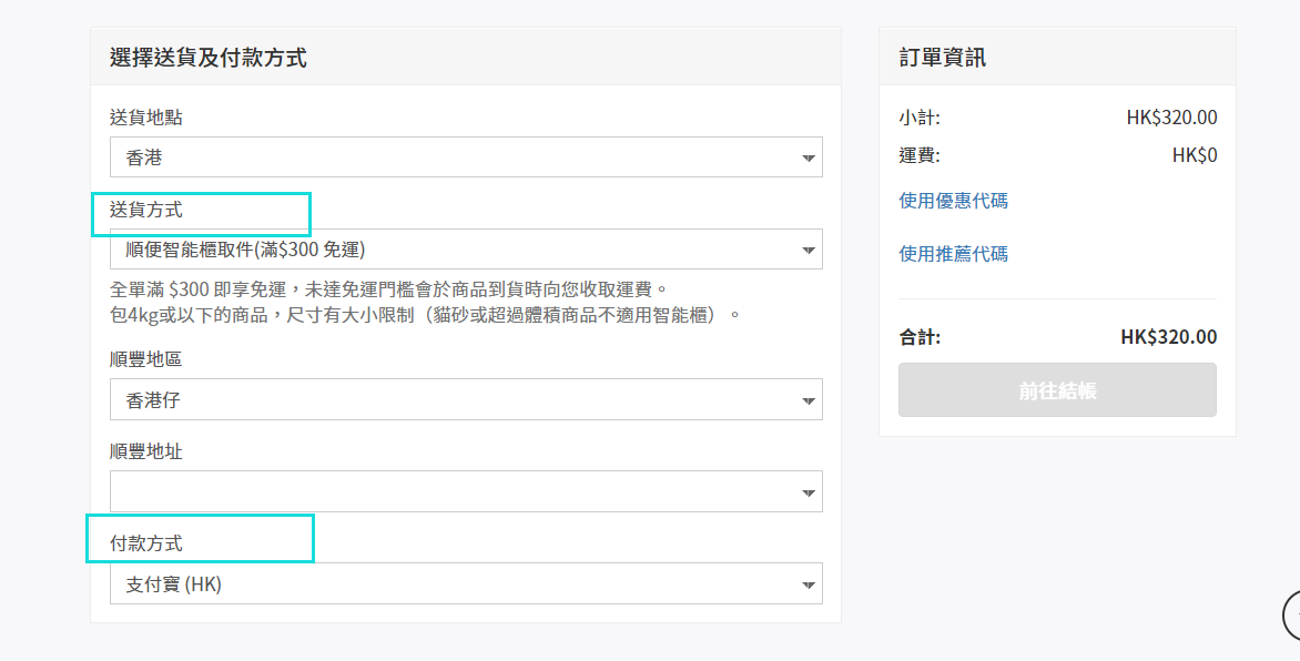 如「送貨方式」為智能櫃或便利店,需要選擇「順豐地區」和「順豐地址」後,再選擇「付款方式」,然後再按「前往結賬」。然後在下一頁面填寫「送貨資料」。最後按「我同意網站服務條款及隱私政策」後,再按「提交訂單」就完成訂貨了!