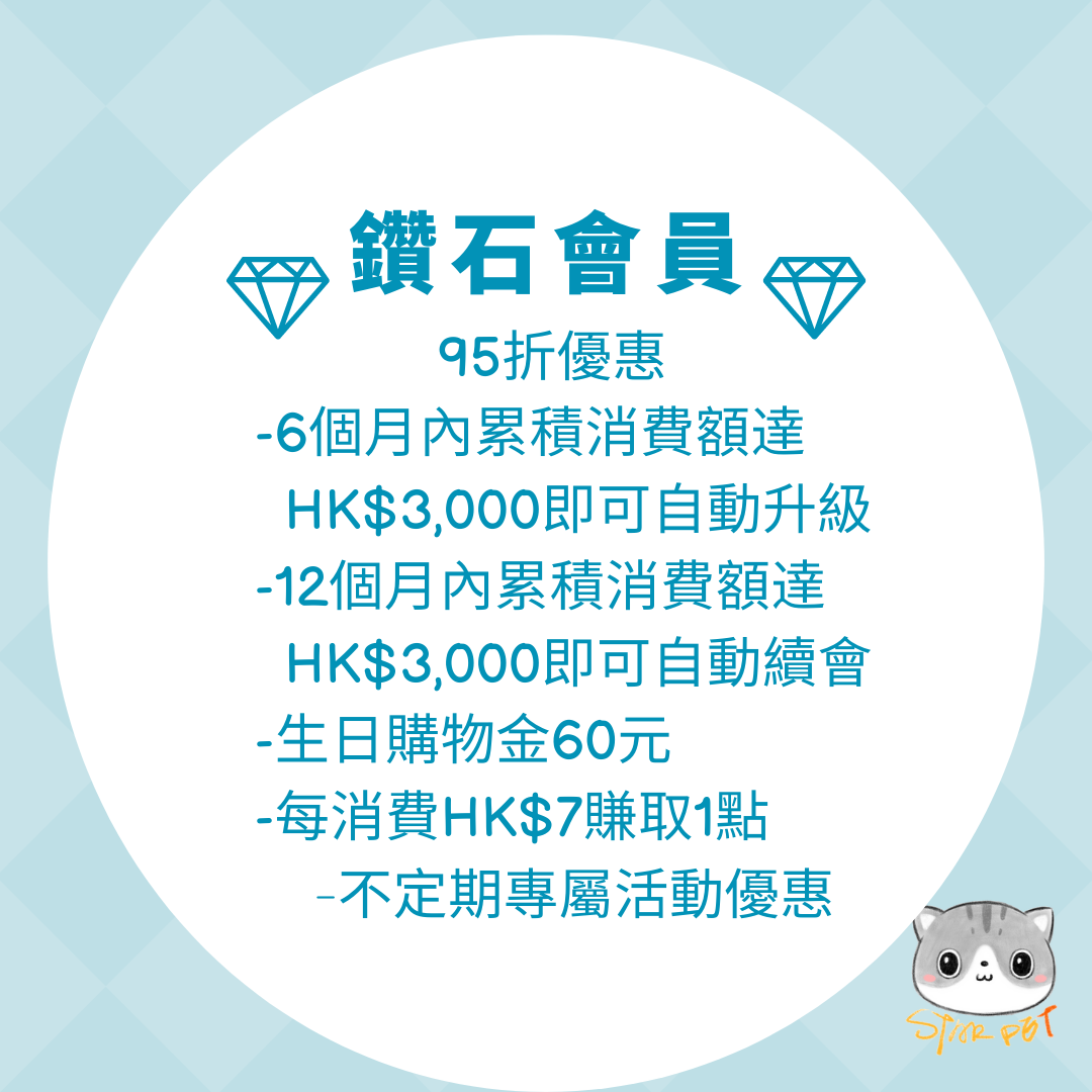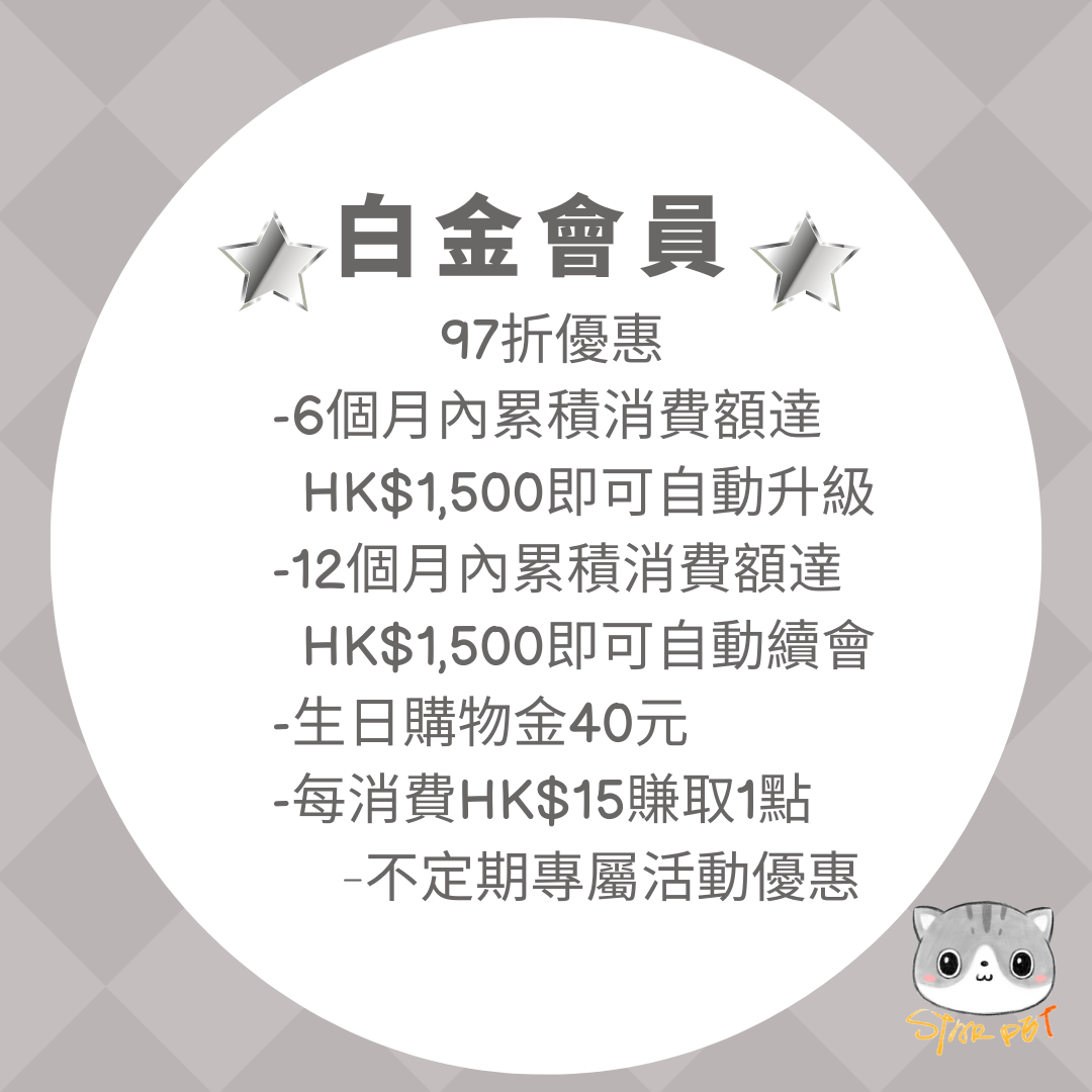 StarPet將以6個月內累積消費金額決定你的會員等級,分為一般會員、白金會員、鑽石會員。各個等級均享有不同的精彩優惠會員禮遇!