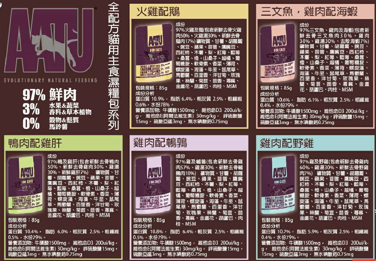 97%三文魚,雞肉及蝦(含三文魚30%,雞肉30%,雞湯30%,蝦7%),礦物質,紅薯,胡蘿蔔,豌豆,蘋果,琉璃苣,鷹嘴豆,番茄,薯片,梨,蔓越莓, 藍莓,桑樹,橙子,越桔,牛皮,葡萄糖胺,軟骨素,歐芹,薄荷,螺旋藻,海藻,牛至,鼠尾草,馬鬱蘭,百里香,洋甘菊,玫瑰果,絲蘭,菊苣,茴香,刺蕁麻,萬壽菊,葫蘆巴,肉桂,MSM。