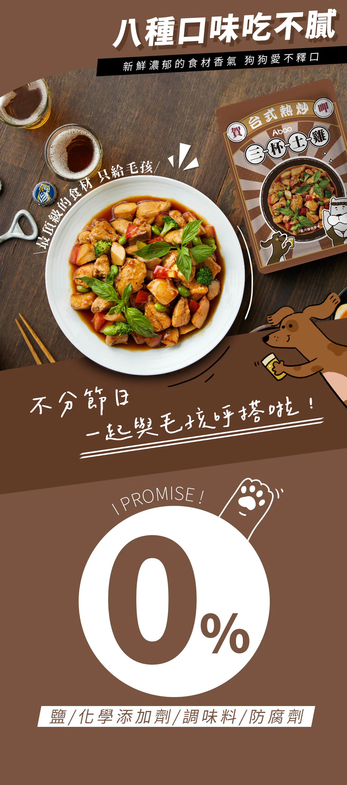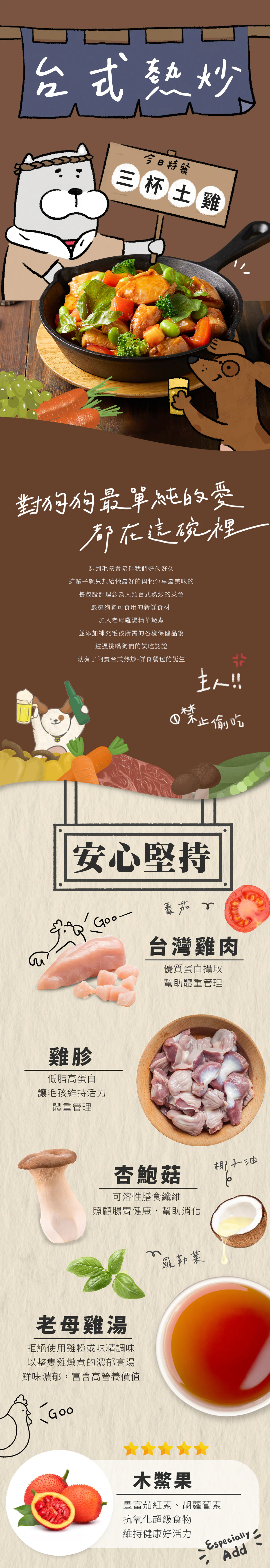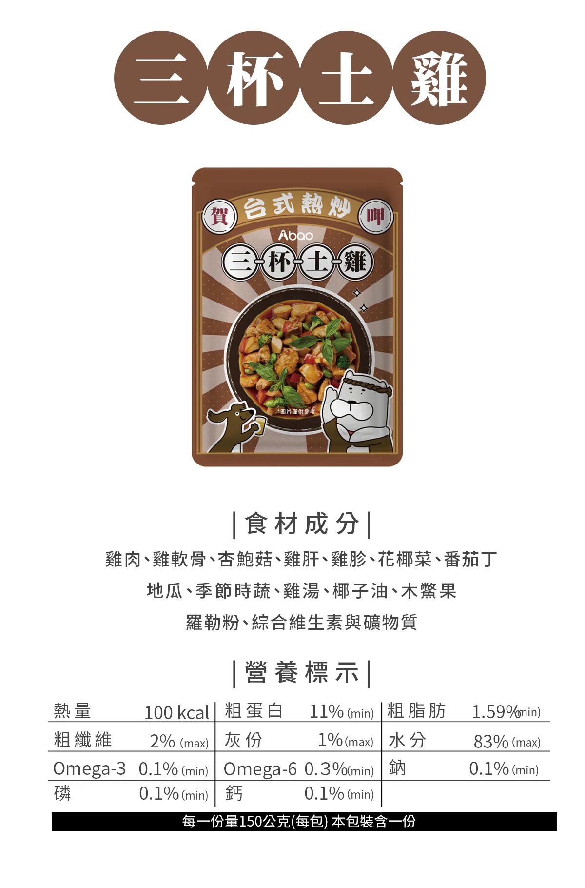 雞肉、雞軟骨、杏鮑菇、雞肝、雞胗、花椰菜、蕃茄丁、地瓜、季節時蔬、雞湯、椰子油、木鱉果、羅勒粉、綜合維生素礦物質