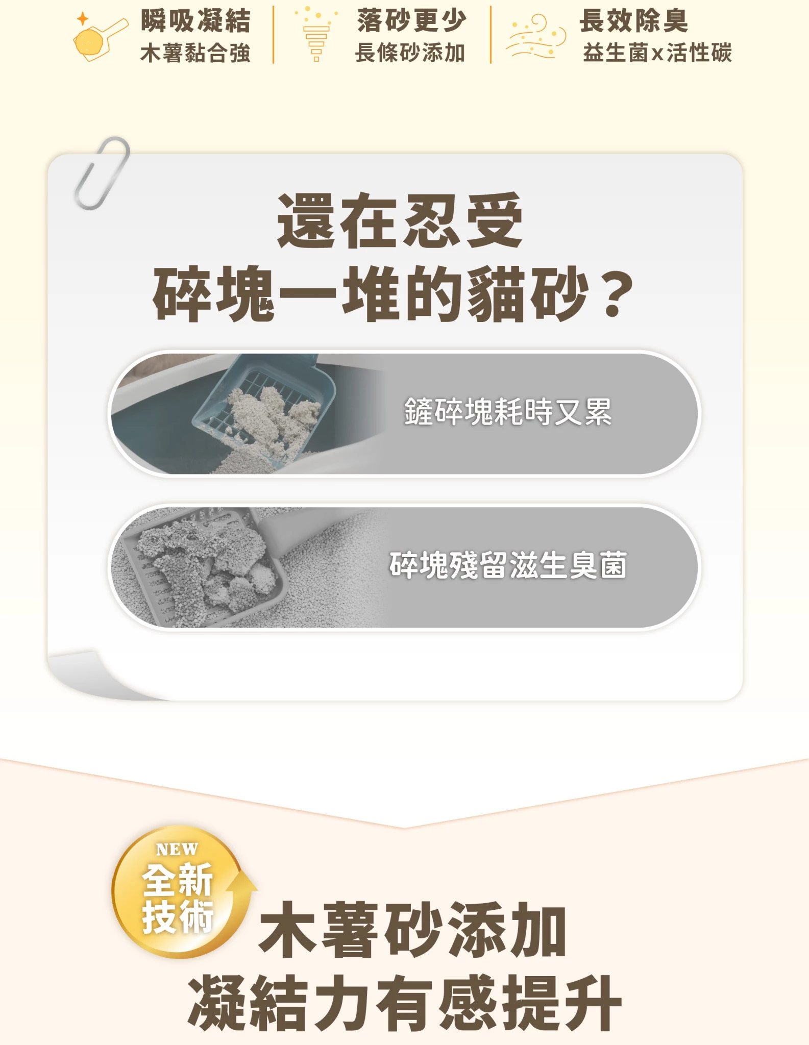 • 木薯砂添加,增強貓砂凝結力,告別碎塊!