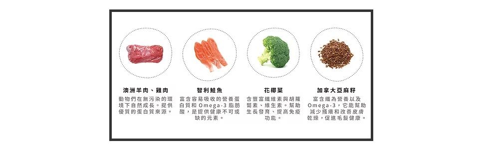 新鮮雞肉、羊肉、鮭魚、鷹嘴豆、南瓜、菠菜、花椰菜、甜菜、亞麻籽、海藻、番茄、魚油、雞油、酵母、乳酸菌、木瓜酵素、絲蘭萃取物、牛磺酸、氯化鉀、葡萄糖胺、軟骨素、維生素A(β-胡蘿蔔素)、維生素(B1、B2、B4、B6、B12、D、K)、維生素C、維生素E(天然防腐劑)、菸鹼酸、泛酸鈣、葉酸、碘化鉀、亞硒酸鈉、果寡糖、DL-蛋氨酸、DHA、EPA、有機礦物質(銅、鐵、錳、鋅、碘、鈷、硒、硼、錫、釩、钼、鈦、鎂、矽)。
