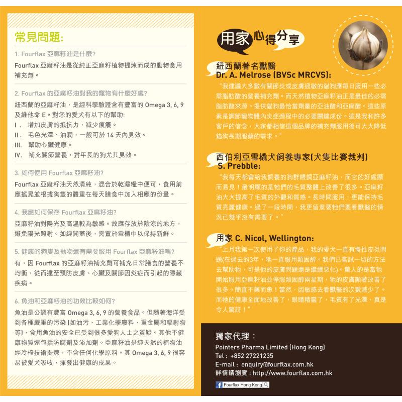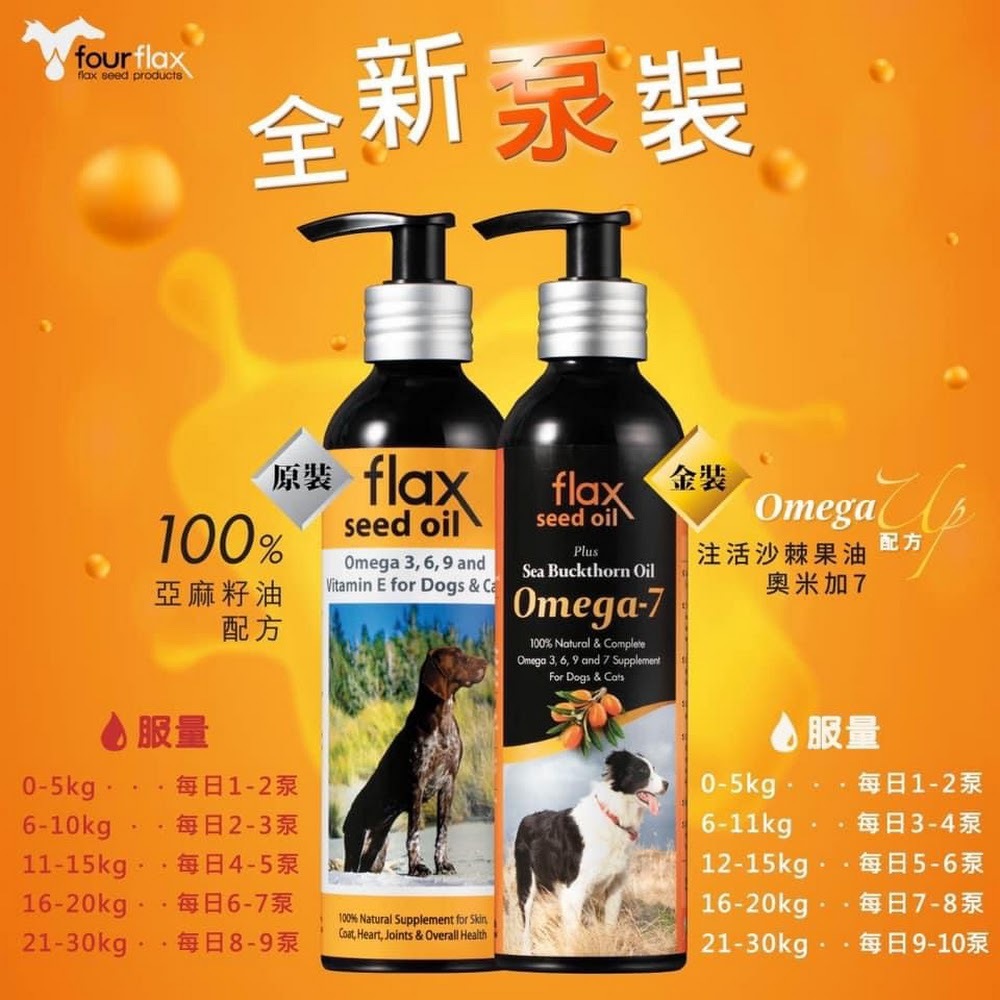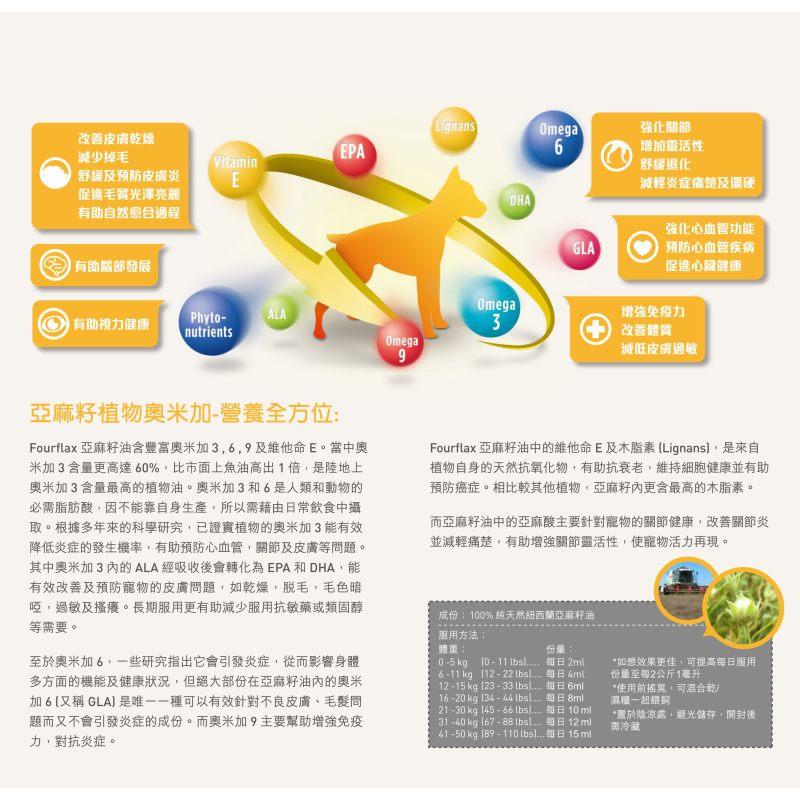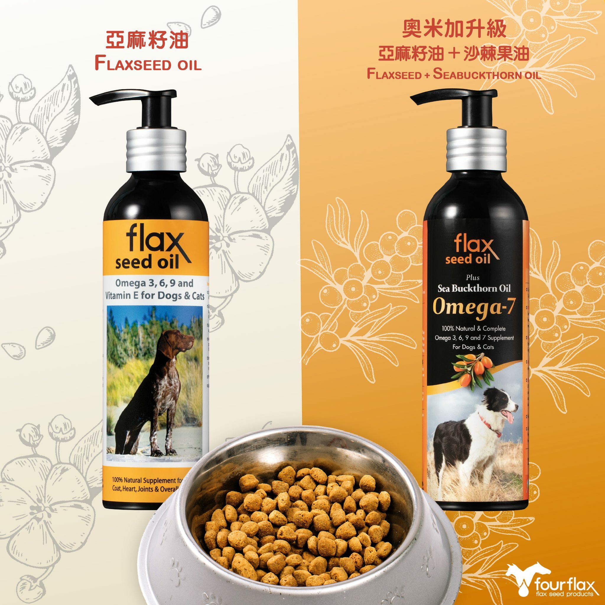 Fourflax 亞麻籽油含豐富奧米加 3、6、9 脂肪酸及維他命 E。當中奧米加 3 含量更高達 60%,比市面上魚油高出 1 倍,是陸地上奧米加 3 脂肪酸含量最高的植物油。奧米加 3 和 6 脂肪酸是人類和動物的必需脂肪酸,因不能靠自身生產,所以需藉由日常飲食中攝取。根據多年來的科學研究,已證實植物的奧米加 3 脂肪酸能有效降低炎症發生機率,有助預防心血管、關節及皮膚等問題。其中奧米加 3 內的 ALA 經吸收後轉化為 EPA 和 DHA,能有效改善及預防寵物的皮膚問題,如乾燥、脫毛、毛色暗啞、過敏及搔癢。期服用更有助減少服用抗敏藥或類固醇等需要。