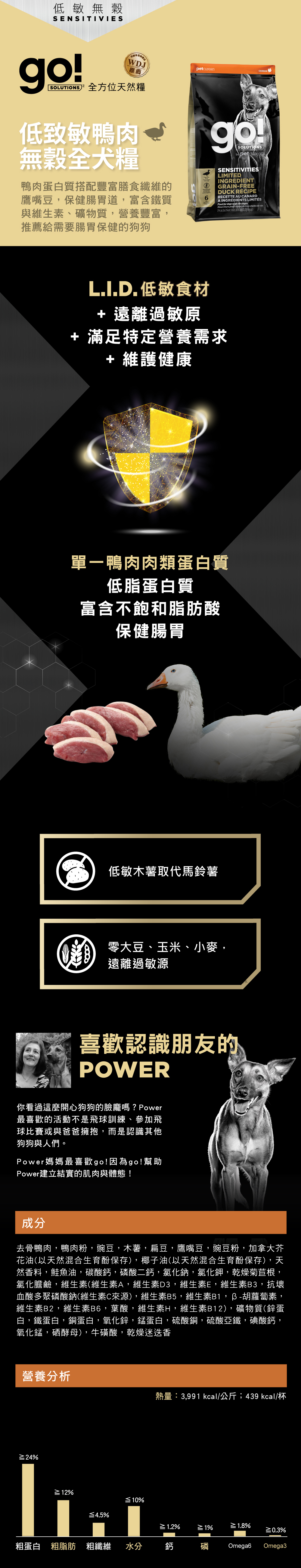GO! SOLUTIONS™ 低敏美毛系列 鴨肉狗糧配方是全新加入抗敏美毛系列的配方,採用高級鴨肉為單一家禽蛋白來源及以限定食材作為配方。 抗敏美毛系列適合所有狗隻,特別適合對食材敏感而需要特別膳食照顧的狗隻。