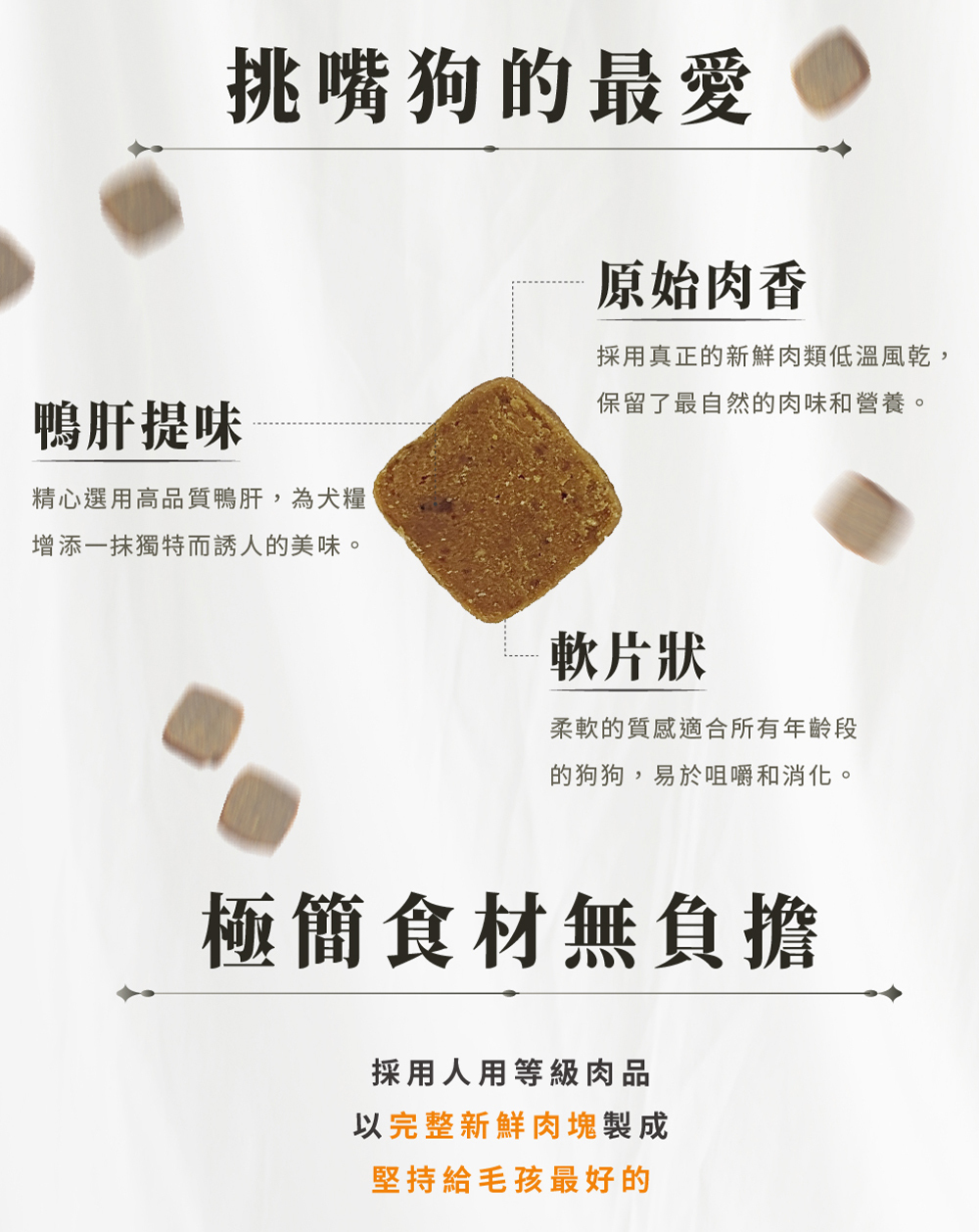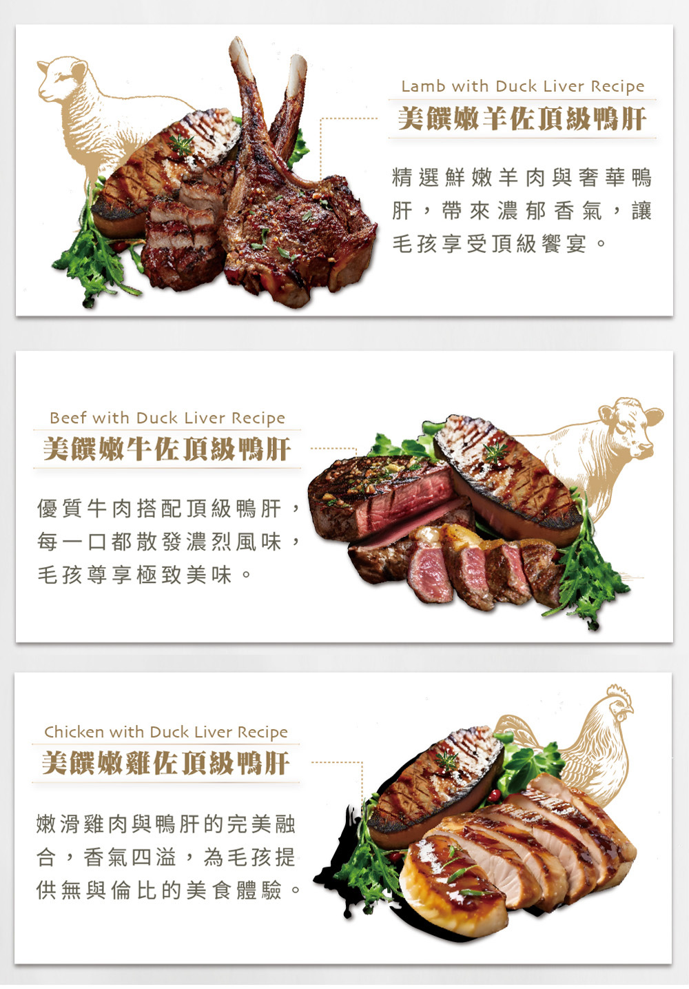 嚴選雞肉及頂級鴨肝,回歸寵物最自然的飲食需求。