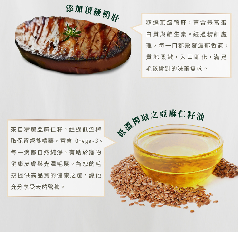 添加低溫榨取亞麻仁籽油,自然補充Omega-3,呵護皮毛健康。