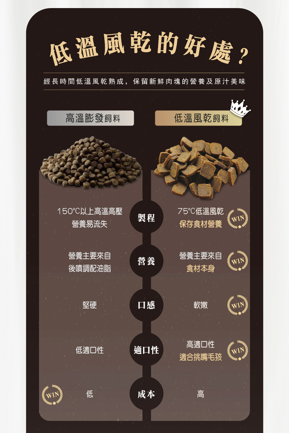 採用75℃低溫風乾技術,歷經長時間熟成,完整保留新鮮肉塊的營養與肉香。
