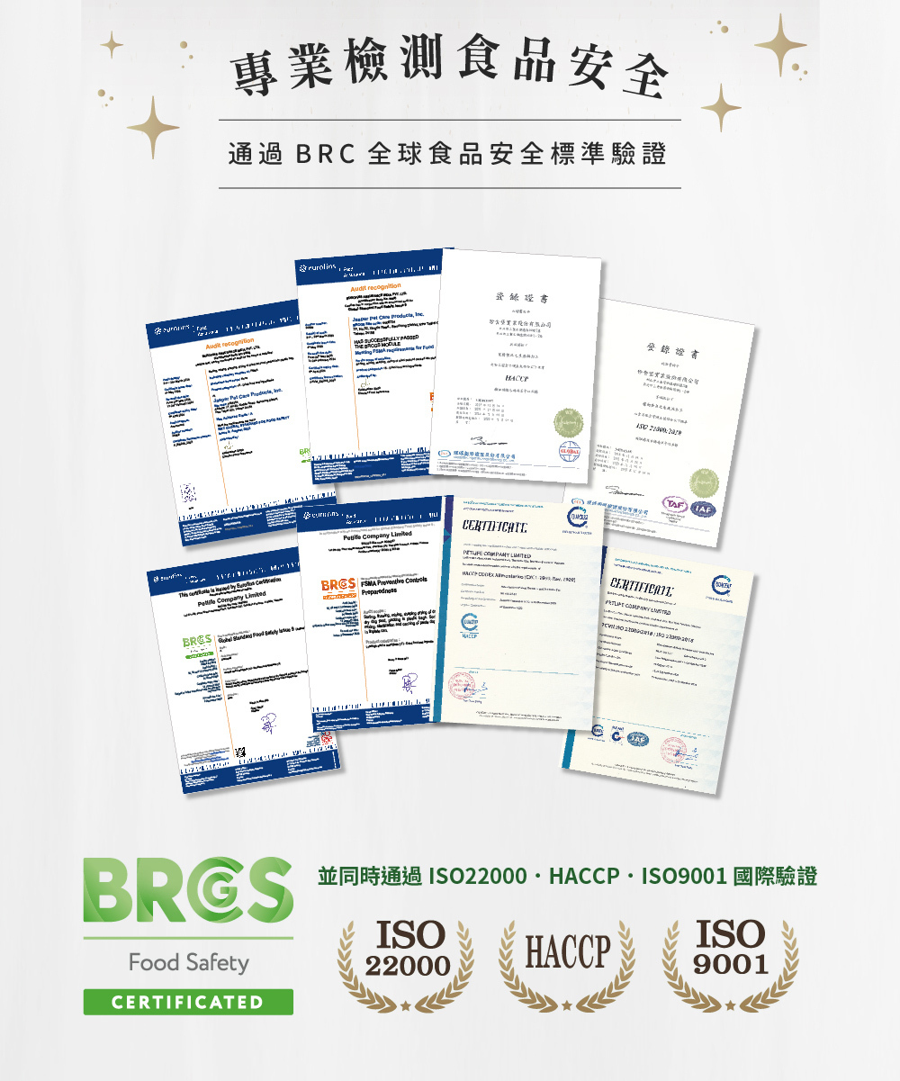通過BRC全球食品安全標準及ISO22000等國際驗證。