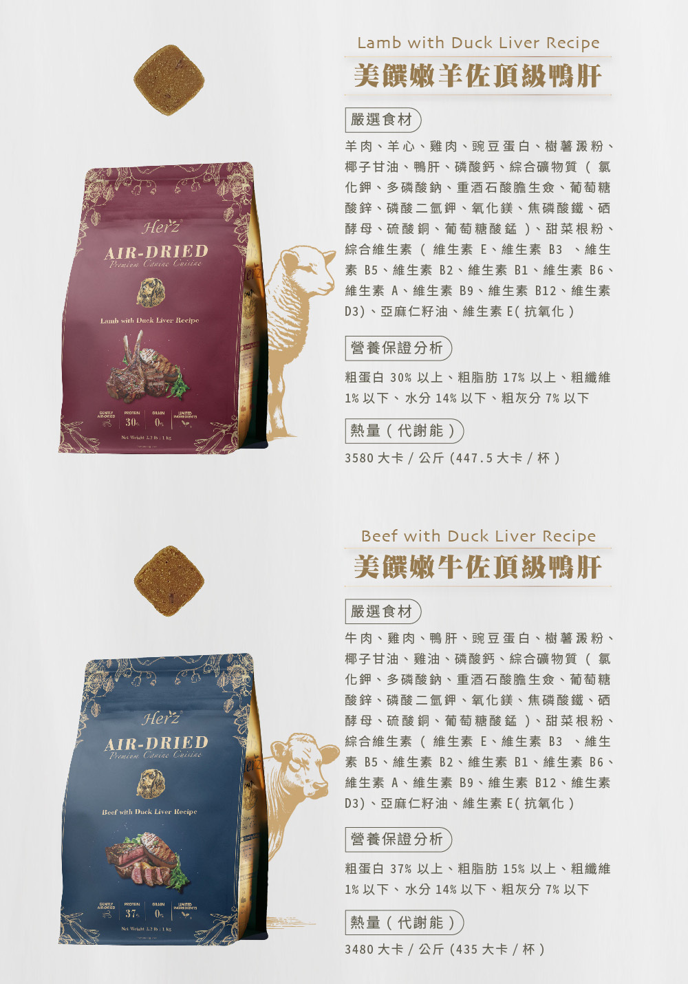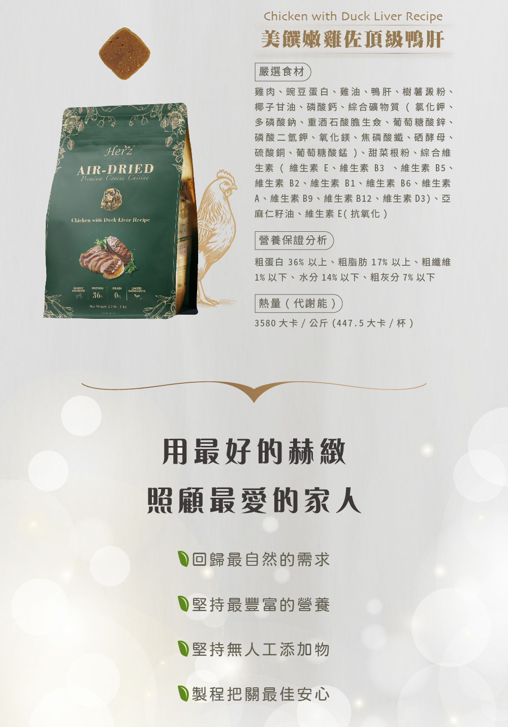 Herz 赫緻 – 美饌低溫風乾糧,專為挑嘴毛孩研發,嚴選雞肉、豌豆蛋白、雞脂肪及頂級鴨肝等優質成分,以完整新鮮的鮮肉塊融合天然無穀低敏配方,回歸寵物最自然的飲食需求。採用75℃低溫風乾技術,歷經長時間熟成,完整保留新鮮肉塊的原汁營養與天然肉香,避免高溫加工造成的營養流失,確保毛孩攝取食材本身的豐富蛋白質與維生素。特別添加高品質鴨肝,讓糧食本身散發濃郁香氣,搭配軟片狀質地,柔嫩易嚼,適合各年齡層寵物消化吸收。堅持無添加化學色素、香料及鹽分,以人用食用等級的鮮肉製成,通過BRC全球食品安全標準及ISO22000等國際驗證,為寵物健康把關。配方添加低溫榨取亞麻仁籽油,滿足挑剔味蕾的同時,自然補充Omega-3,呵護皮毛健康。以專業製程與純淨食材,Herz 赫緻,照顧你最愛的家人。