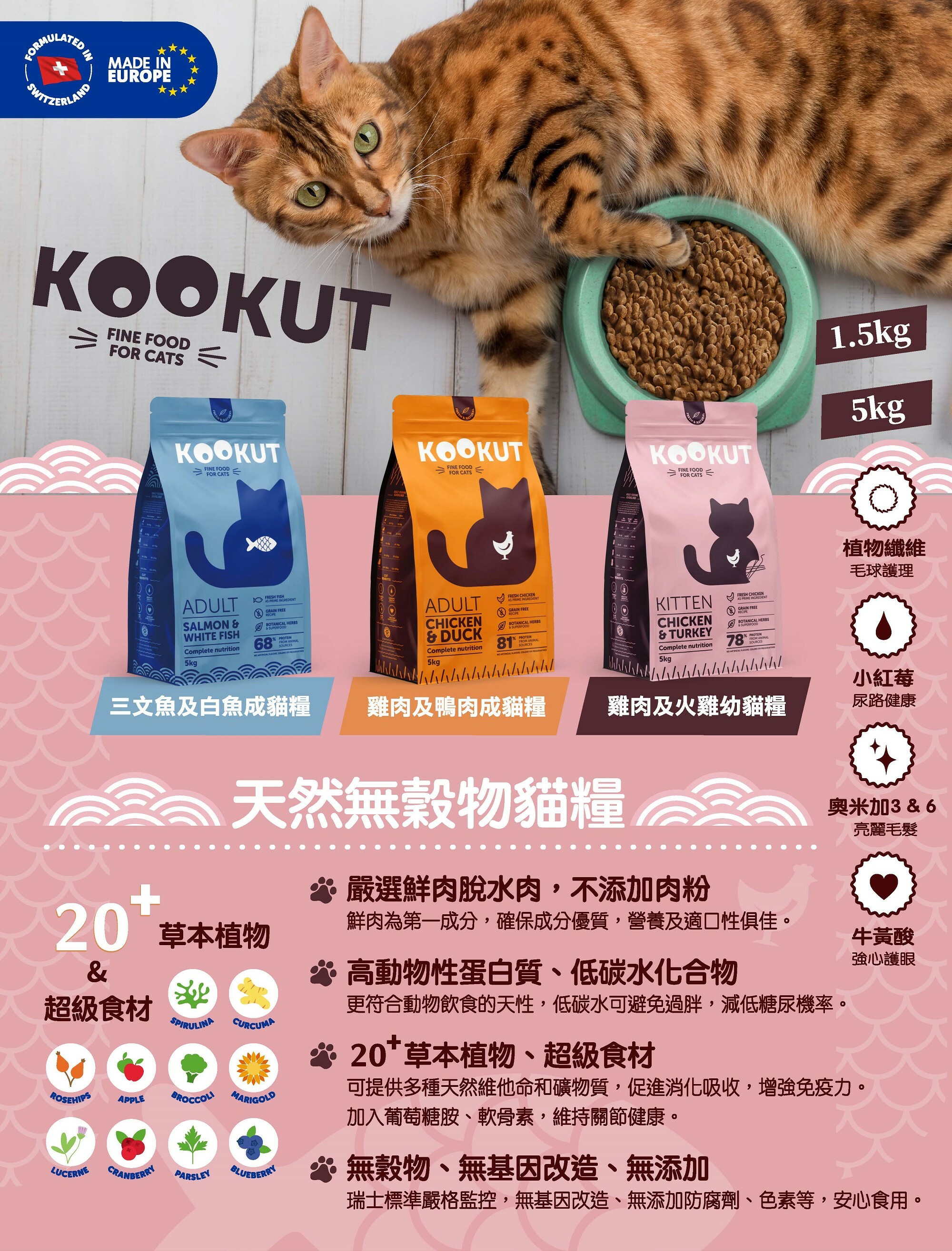 新鮮三文魚、脫水白魚、脫水三文魚、豌豆、去皮豌豆、薯仔、雞脂肪、薯仔蛋白、釀酒酵母、三文魚油、水解雞肉蛋白、亞麻籽、菊苣(FOS和菊粉的天然來源)、玉米油、MOS(單寡糖)、紅蘿蔔、礦物質、西蘭花、菠菜、甜薯、蔓越莓、藍莓、蘋果、螺旋藻乾、鹽酸氨基葡萄糖、硫酸軟骨素、絲蘭乾、迷迭香提取物、葡萄籽提取物、薑黃提取物、丁香葉油、胡蘆巴乾、紫苜蓿、玫瑰果乾、萬壽菊乾(葉黃素的天然來源)、番茜乾、薄荷乾。
