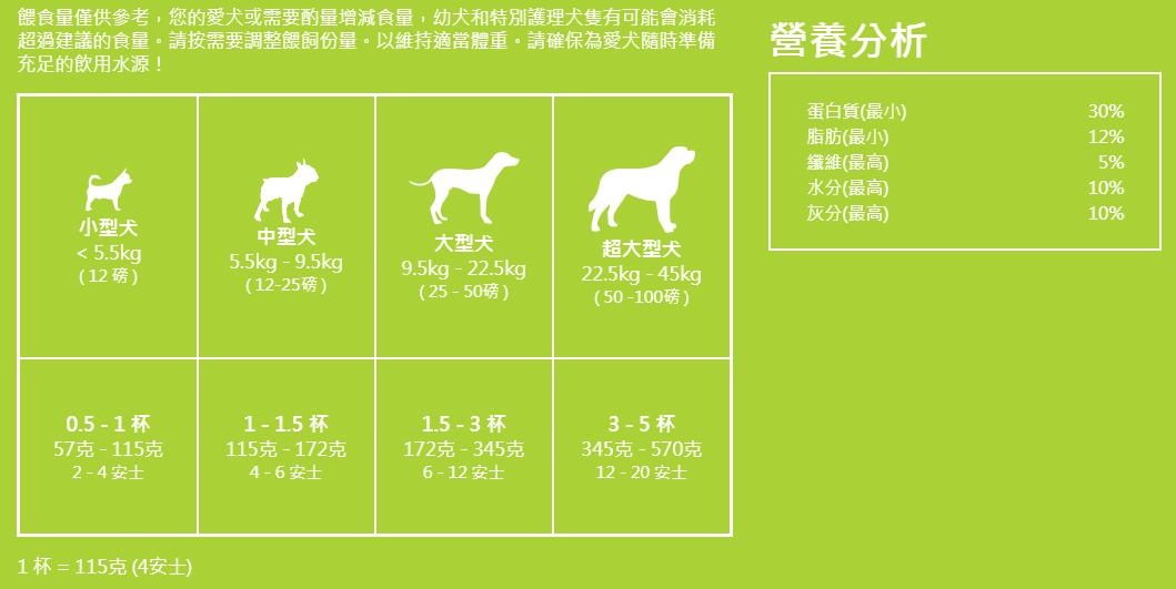 請按需要調整餵飼份量。以維持適當體重。請確保為愛犬隨時準備充足的飲用水源!