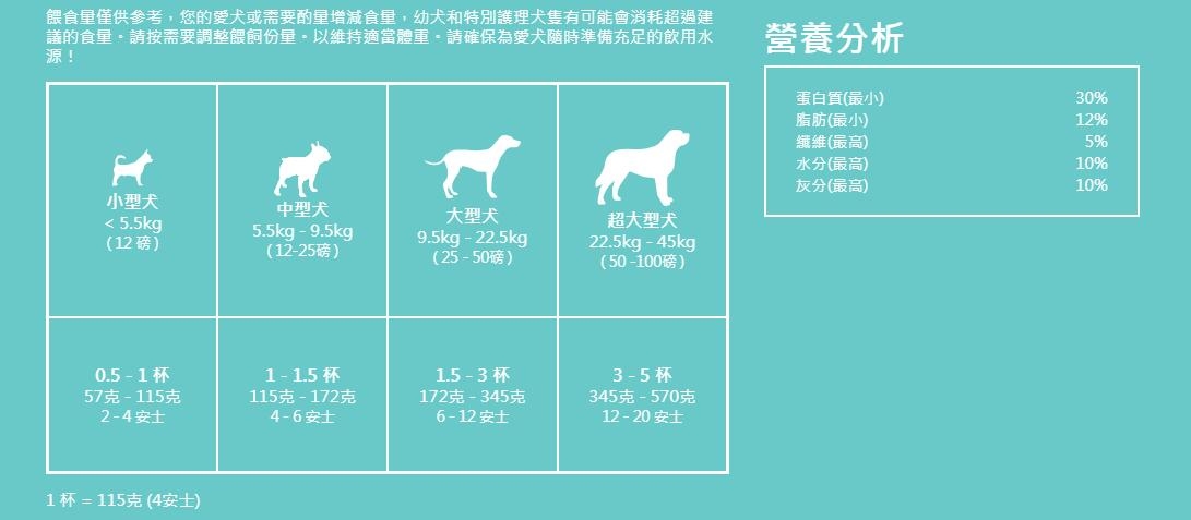 全犬糧:蛋白質(最小) 30% 水分(最高) 10% 脂肪(最小) 12% 灰分(最高) 10% 纖維(最高) 5%