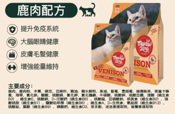 鹿肉、鹿肉粉、木薯、豌豆、亞麻籽、雞油、雞水解粉、魚油、藍莓、蔓越莓、綠唇貽貝、麥盧卡蜂蜜、海帶、氯化納、醋酸、硫酸鎂、氯化鉀、氯化膽鹼、牛磺酸、硫酸鋅、硫酸亞鐵、煙酸 (維生素B3)、維生素E、琉酸銅、D-泛酸鈣 (維生素B5)、硫酸錳、亞硒酸鈉、核黃素 (維生素B2)、硝酸硫胺 (維生素B1)、鹽酸吡哆酵 (維生素B6)、维生素A、D-生物素、氰鈷胺 (維生素B12)、硫酸鈷、葉酸 (維生素B9)、碘酸鈣、維生素D3、茶多酚、迷迭香提取物、留蘭香提取物