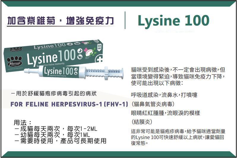 Mervue Lysine 100 用於舒緩貓疱疹病毒引起的病狀