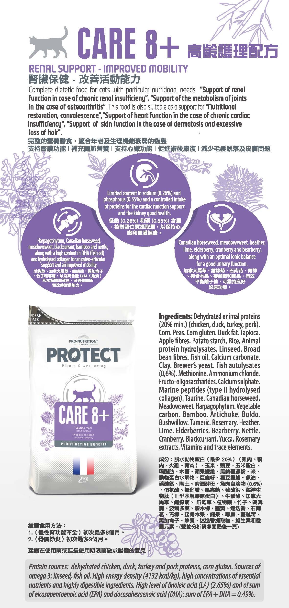 低鈉(0.26%)和低磷(0.55%)配方,並控制蛋白質攝取量,以支持心臟功能和維持腎臟健康