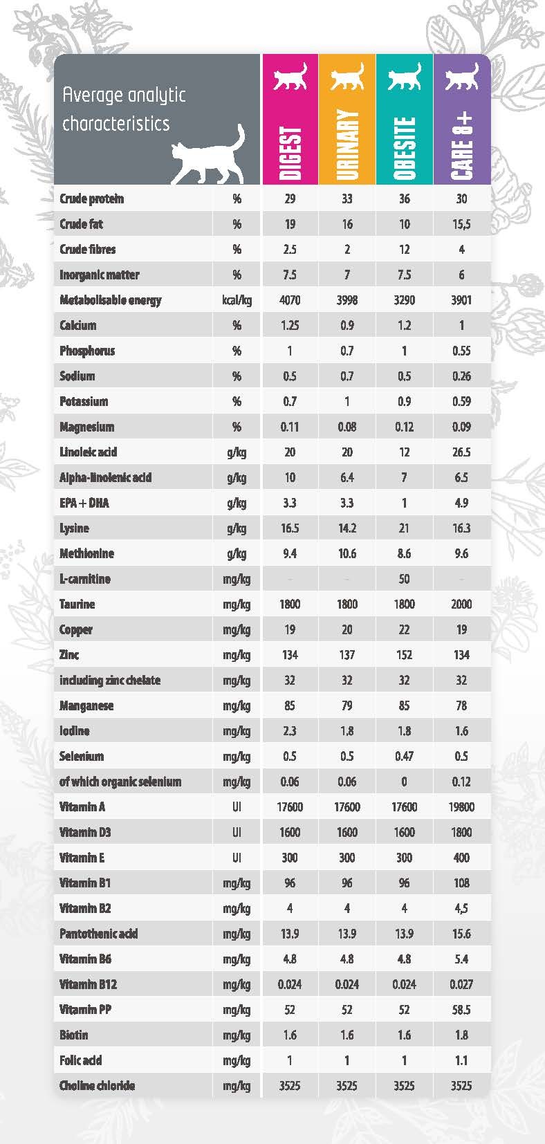 Crude protein 30 %. Crude fat 15.5 %. Crude fibre 4 %. Inorganic matter 6 %. Metabolisable energy 3,901 kcal/kg. Calcium 1 %. Phosphorus 0.55 %. Sodium 0.26 %. Potassium 0.59 %. Magnesium 0.09 %. Linoleic acid 26.5 g/kg. Alpha-linolenic acid 6.5 g/kg. EPA + DHA 4.9 g/kg. Lysin 16.3 g/kg. Methionine 9.6 g/kg. Taurine 2,000 mg/kg. Copper 19 mg/kg. Zinc 134 mg/kg (including Zinc chelate 32 mg/kg). Manganese 78 mg/kg. Iodine 1.6 mg/kg. Selenium 0.5 mg/kg (of which Organic selenium 0.12 mg/kg). Vitamin A 19,800 UI. Vitamin D3 1,800 UI. Vitamin E 400 UI. Vitamin B1 108 mg/kg. Vitamin B2 4.5 mg/kg. Pantothenic acid 15.6 mg/kg. Vitamin B6 5.4 mg/kg. Vitamin B12 0.027 mg/kg. Vitamin PP 58.5 mg/kg. Biotin 1.8 mg/kg. Folic acid 1.1 mg/kg. Choline chloride 3,525 mg/kg.
