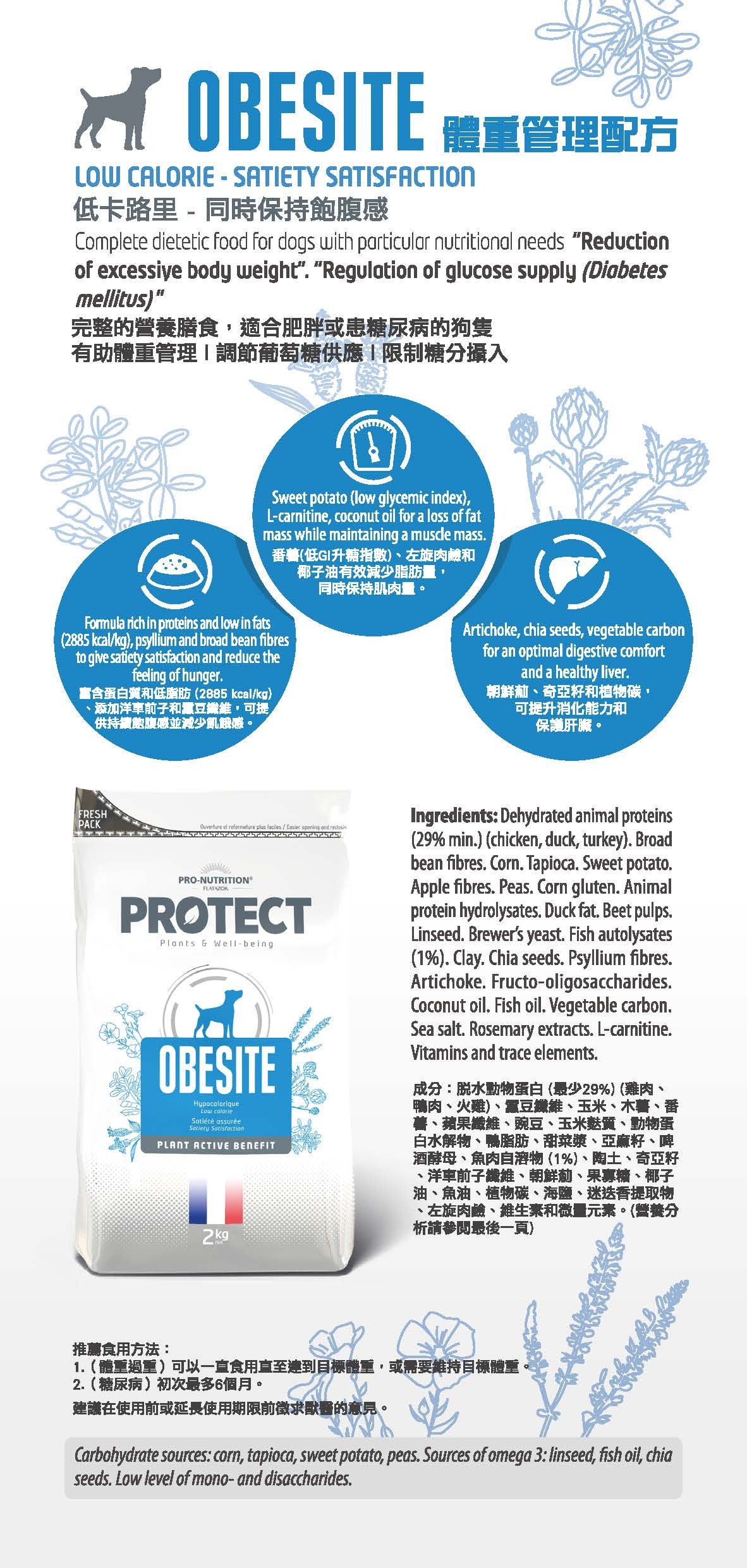 高蛋白低脂配方(2885 kcal/kg),含車前子與蠶豆纖維維持餵食體積並降低飢餓感