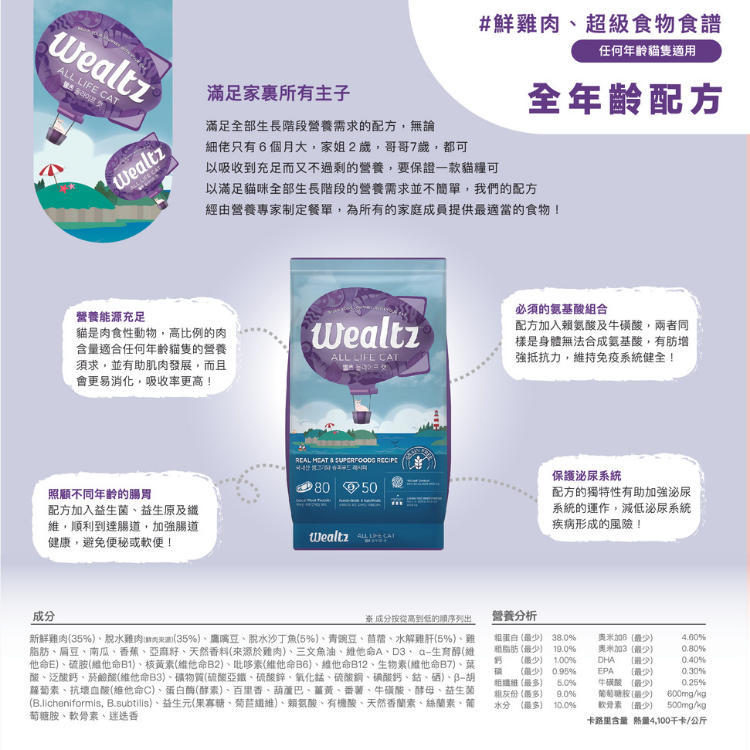 Wealtz 不含任何穀物、馬鈴薯、麩質、玉米等成分!鮮肉隨後的盡是大量超級食物