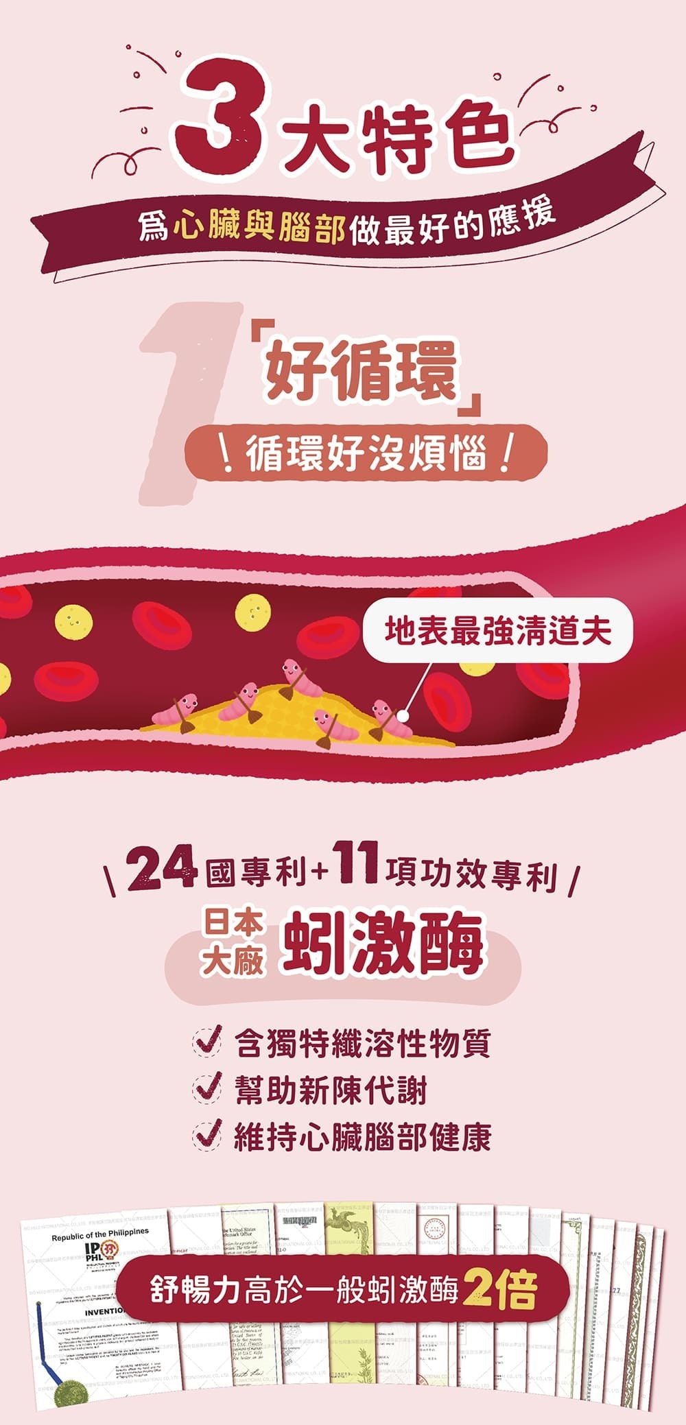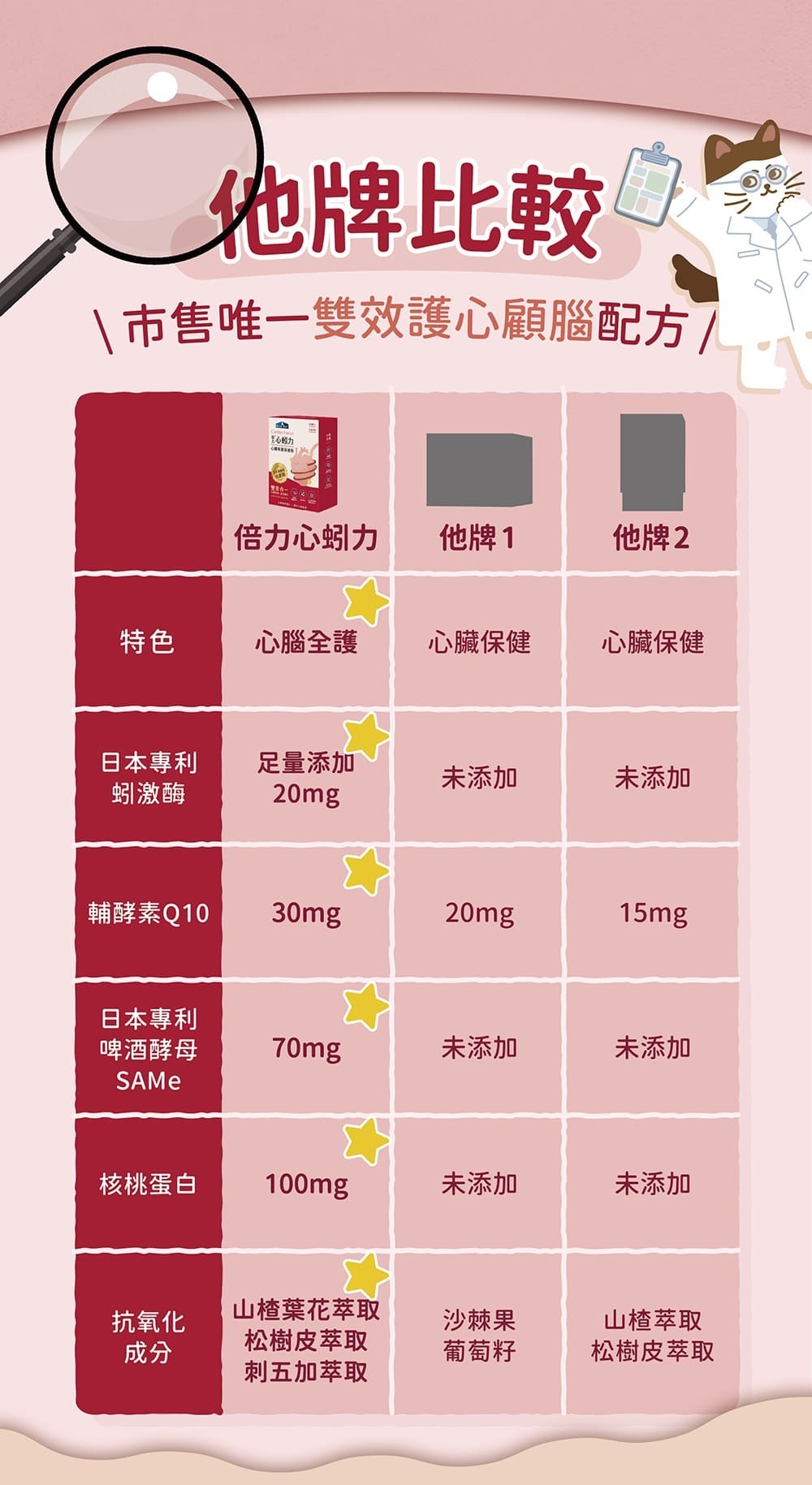 成分:核桃蛋白、SAMe啤酒酵母發酵物、啤酒酵母、植物固醇(松樹來源)、Co-Q10、牛磺酸、山楂葉花萃取物、蚓激酶、刺五加萃取、維生素C、維生素E