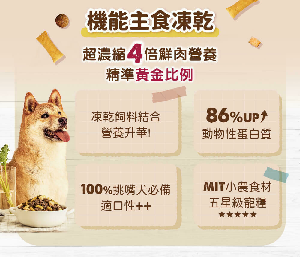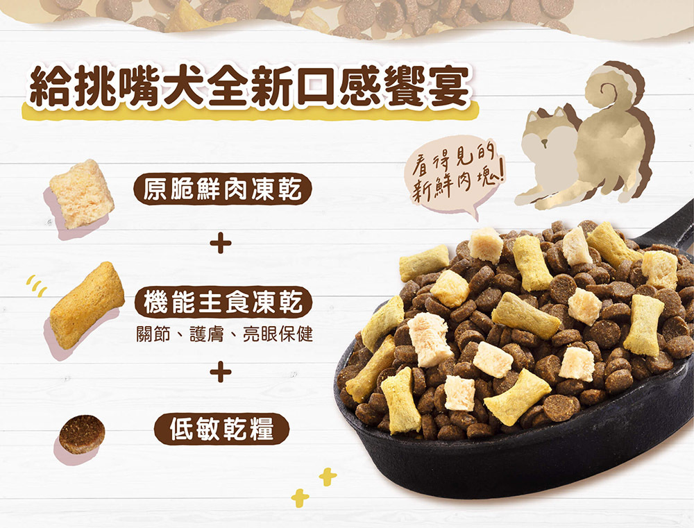 ▸ 低敏乾糧 + 機能主食凍乾 + 原脆鮮肉凍乾